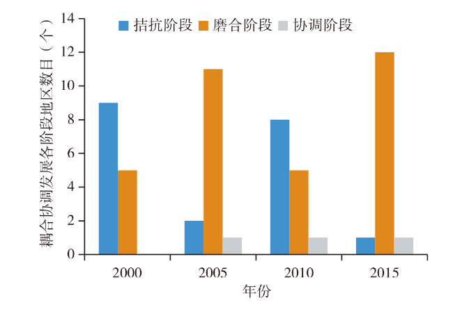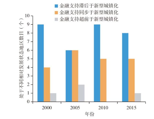 图3 新型城镇化建设与金融支持耦合协调发展阶段频率统计Fig.3 Status of coupling coordination development period between new urbanization construction and financial support |