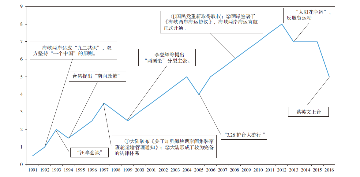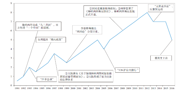 两岸关系 | 反映不同时期两岸间的关系,为将两岸关系定量化,将1991—2015年两岸关系定义“0~8” | H2:与解释变量呈正相关 | |