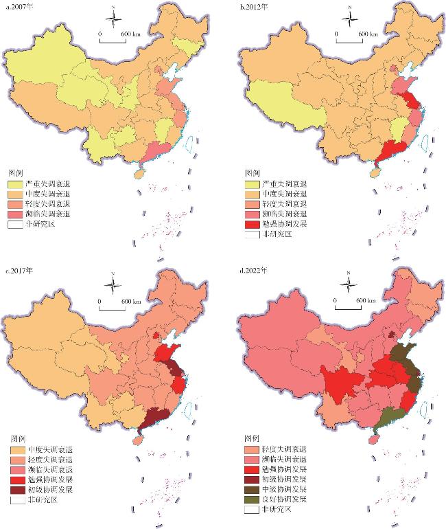 表4 2007—2022年全国整体耦合协调度及变化Tab.4 Coupling coordination degree in China from 2007 to 2022 |