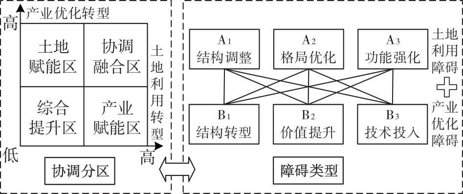综合提升区 | “土地—产业”双转型均处于较低水平,土地利用与产业优化的矛盾突出、错配明显,均难以支撑区域城乡融合 | 尊重经济社会阶段,追求“土地—产业”双转型的循序渐进和融合协同趋势,避免单向冒进发展 | A1B2型 | 1 | |