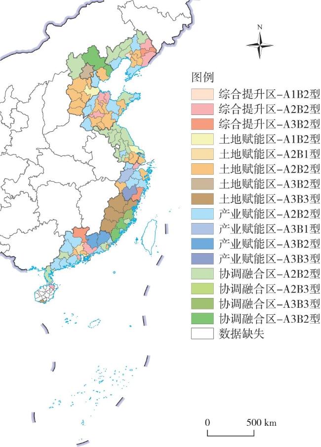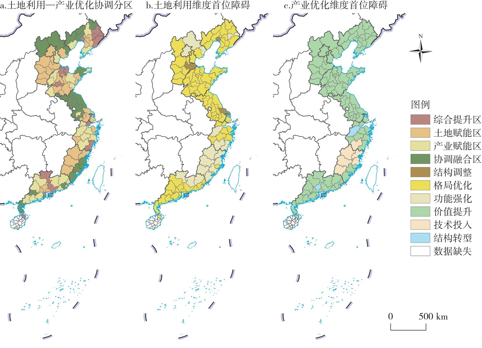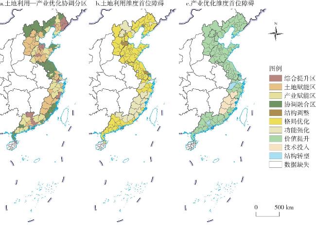 图5 东部沿海地区“土地—产业”双转型的协调分区和障碍类型识别结果Fig.5 Identification results of coordinated zones and obstacle types in eastern coastal areas based on the “land-industry” dual transformation |
