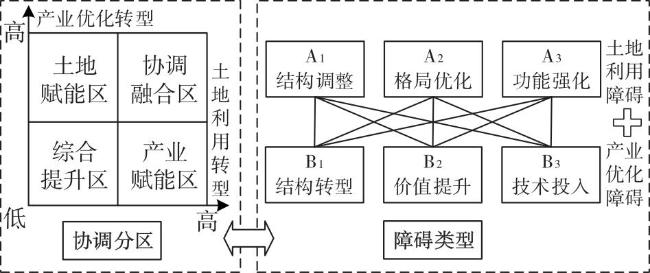 产业赋能区 | 产业优化转型较土地利用转型存在时滞,未充分利用土地资源条件,引导城乡产业布局和升级,尚未显化充足的产业经济和社会价值 | 充分利用土地禀赋,挖掘可能产业化的自然人文资源,促进产业体系化和高新化转型,提高土地资源利用效率 | A2B2型 | 23 | |