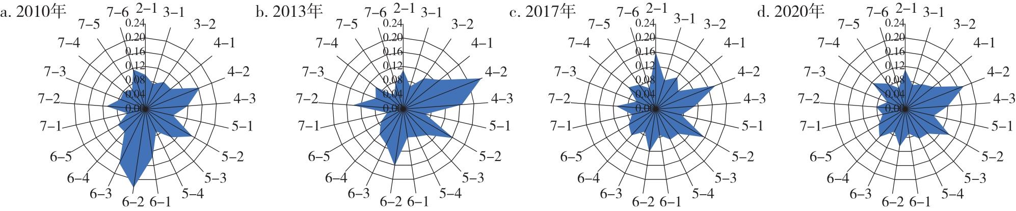 表3 2010—2020年黄河流域城市群生态安全能级差异及分解Tab.3 Difference and decomposition of ecological security level in urban agglomerations of the Yellow River basin from 2010 to 2020 |