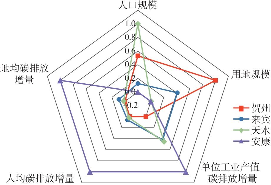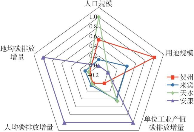 | 空间结构 | 代表城市 | 人口规模 (万人) | 用地规模 (km²) | 人均碳排放增量 (t/人) | 地均碳排放增量 (t/km²) | 单位工业产值碳排放增量 (t/万元) |