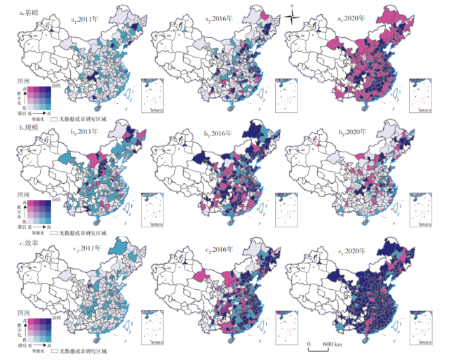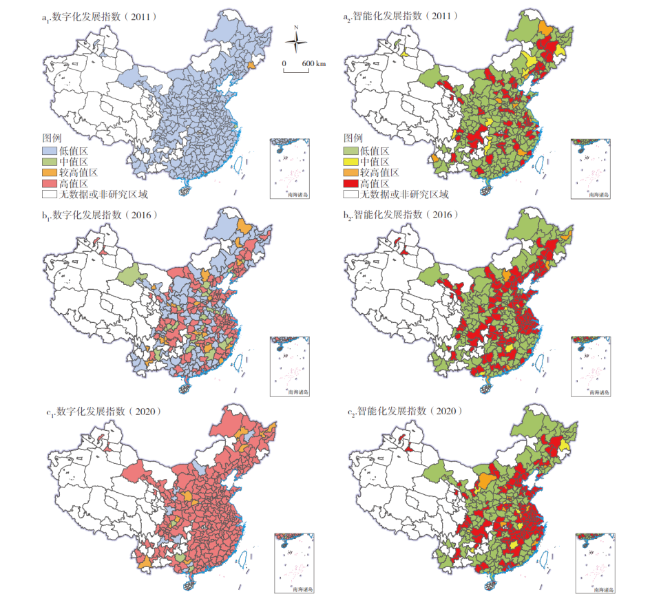协同推进数字化与智能化对经济社会高质量发展至关重要。文章在对数字化与智能化协同发展内涵解析的基础上,通过构建市域尺度多维数字化与智能化协同发展评价指标体系,刻画了2011—2020年中国284个市域数智协同发展的进程状态、时空格局及聚集特征。研究发现:①中国市域数字化与智能化协同发展水平整体处于中低区间,数智协同发展态势良好的市域主要集中于东部沿海地区,协同较为迟缓的市域主要位于中西部地区。②中国市域数字化与智能化协同发展水平由高至低可分为协同发展、趋向协同、协同失调与协同滞后4种类型,其中后3种类型间转化较为活跃。③中国市域数字化与智能化协同发展态势呈现由基础到规模维度递减规律,数智效率发展进程呈现出一定区域分异特征。④中国市域数字化与智能化协同发展有显著的正相关关系,空间分布有聚集的趋势。最后,通过对不同协同发展类型区域的问题识别,提出了中国市域差异化数字化与智能化协同发展的提升路径。