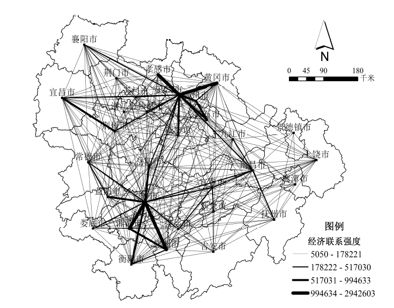 结合引力模型、交通运输成本模型、网络中心度模型、块模型和QAP模型,分析长江中游城市群城市网络空间关联及其驱动因素得出:①武汉城市圈、环长株潭城市群内部的经济联系强度均高于环鄱阳湖城市群,且武汉城市圈与环长株潭城市群之间的经济联系强度较为突出,长江中游城市群已经以武汉市和长沙市为中心形成了两个明显的城际经济联系密集区。②长江中游城市群三大城市群的综合运输成本存在差异。环长株潭城市群内部交通一体化程度最高,环鄱阳湖城市群最低。长沙市至武汉城市圈、武汉市至环长株潭城市群的交通运输成本明显低于长沙市、武汉市至环鄱阳湖城市群城市的交通运输成本。③长江中游城市群城市网络对外辐射能力整体较强,而整体的吸引能力相对偏弱,即三大城市群之间的经济联系较弱,而其内部的城际经济联系则较强。环长株潭城市群对外辐射、吸引和中介能力整体最强,环鄱阳湖城市群相对最弱。④长江中游城市群城市关联网络可以划分为主溢出板块、净受益板块、经纪人板块、主受益板块四个功能板块。主溢出板块是长江中游城市群城市关联网络的发动机,净受益板块处于相对边缘的位置,经纪人板块是主溢出板块和主受益板块之间联系的桥梁。⑤在多因素共同作用下,城市之间地理位置相邻、交通基础设施水平相近、产业结构相近和外向型经济结构相近有助于长江中游城市群城市关联网络发展,而外资利用水平、互联网开放程度等方面的差异化发展促进了城市之间的空间关联。