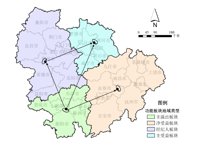 表6 长江中游城市群各功能板块之间的溢出效应分析结果Tab.6 Analysis results of spillover effect among functional blocks of urban agglomeration in the middle reaches of the Yangtze River |
