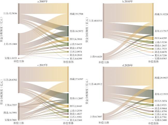 Based on the land use data of 11 provincial-level regions of the Yangtze River mainstream from 2005 to 2020, this study adopts the water footprint method to introduce self eco-consumption value coefficient, combines with the ecosystem services value method, and considers the supply and consumption of ecological value to explore the spillover value of ecosystem services in different provinces. Based on the determination of horizontal ecological compensation (HEC for short) standards, a comparative ecological radiation force model is introduced to optimize HEC funds allocation scheme for 11 provinces in the Yangtze River mainstream from the perspective of ecosystem services flow. The results show that: 1) The ecosystem service value of the Yangtze River mainstream declines slowly at first and then increases steeply from 2005 to 2020, with an overall increase of 3.16%. 2) The value of ecological consumption in the Yangtze River mainstream shows an inverted-U shape, but increases slightly in general, and shows a trend of gradual growth from the west of the Yangtze River mainstream to the east of the Yangtze River mainstream. 3) The overall ecosystem services of the Yangtze River mainstream are in a spillover state during the study period. The compensation standards, in descending order, are Xizang, Qinghai, Sichuan, Yunnan, Jiangxi, Hunan, Chongqing, Hubei, Anhui, Shanghai and Jiangsu. 4) Jiangsu is required to pay more than 60% of the total, and is the main source of HEC funds in the Yangtze River mainstream. Anhui and Shanghai were the least responsible for compensation in 2005 and 2015, 2010 and 2020, respectively. 5) Xizang receives more than 50% of the total compensation funds, and is the main recipient of HEC. Anhui receives the least compensation in 2010 and 2020. Hubei and Chongqing receive the least compensation in 2005 and 2015, accounting for less than 0.7%.