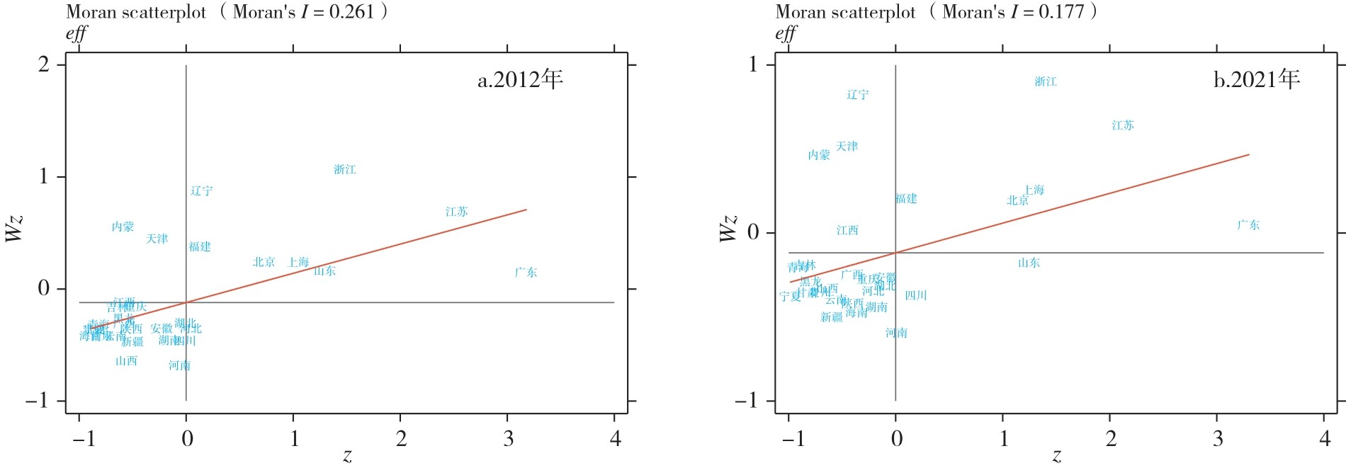 表6 2012—2021年流通业高质量发展全局莫兰指数Tab.6 Global Moran index for high-quality development of the circulation industry from 2012 to 2021 |