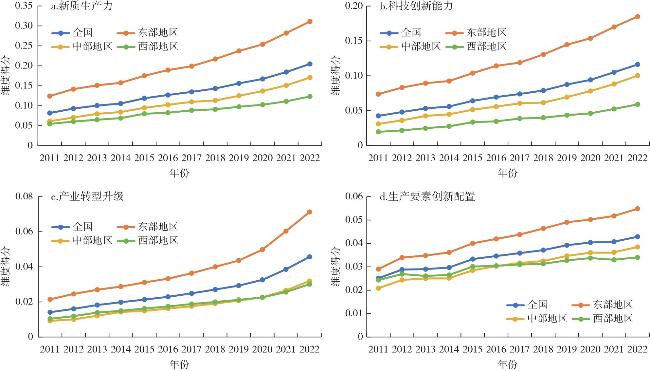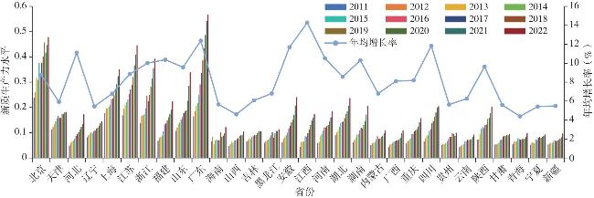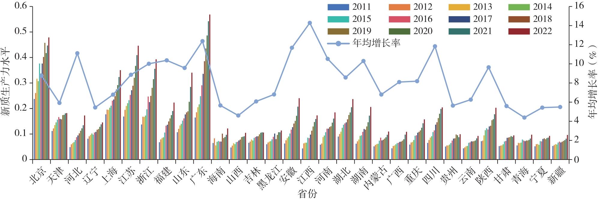 表2 中国30个省份新质生产力发展各维度指数均值及增长率Tab.2 Averages and growth rates of sub-dimension indicators of new quality productive forces of 30 provincial regions in China |