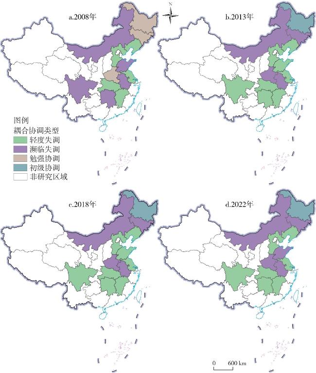 图3 中国粮食主产区粮食安全贡献度与农业技术创新耦合协调度的空间分布演变注:基于自然资源部标准地图服务网站下载的审图号为GS(2019)1815号的标准地图制作,底图边界无修改。 Fig.3 Spatial distribution of coupling coordination between contribution to food security and agricultural technology innovation in China's major grain-producing regions |