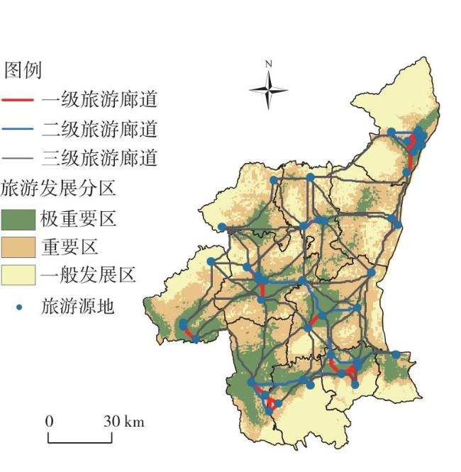 随着全域旅游战略的深入推进,旅游廊道体系的构建及其空间布局的优化已成为推动文旅产业融合发展与实现可持续发展的必然路径选择。文章以陕西省渭南市为例,根据旅游热度值识别旅游源地,进而采用MCR模型和重力模型提取渭南市的旅游廊道,并对不同情景的旅游网络结构进行了分析和评价。 结果表明:①渭南市44个旅游源地与118条旅游廊道构成全域旅游空间的基本格局,其中包括44条一级廊道,15条二级廊道和59条三级廊道,廊道总长2423.02 km,识别出旅游“夹点”46处,障碍点28处。②根据旅游源地的不同模拟情景,增“源”全面发展情景对旅游网络系统的效能提升有限,优化减“源”发展情景比增“源”全面发展情景对网络系统的改善更加有效。③根据旅游综合阻力值,将渭南市旅游发展空间划分为旅游发展极重要区、重要区和一般重要区,并针对性地提出差异化的旅游发展策略,为渭南乃至全国文旅融合高质量发展提供了科学依据。