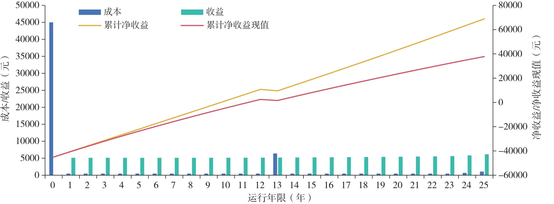 | 系统成本 | C | 光伏发电系统为39000元;储能电池为6000元;光伏与储能系统年运维费率分别为1%和1.5% | 光伏成本数据来自王怀斌[23];储能成本数据来自张兴等[24];运维费率数据来自王小虎等[11] | 光伏发电系统(含光伏组件、组件支架、逆变器、安装费等)单位成本为3.9元/W;锂电池单位容量成本为600元/kW·h;故10 kW光伏—10 kW·h储能系统初始投入成本为45000元。电池更换成本为6000元。系统运维费用为480元/年(光伏系统390元/年;储能90元/年) |