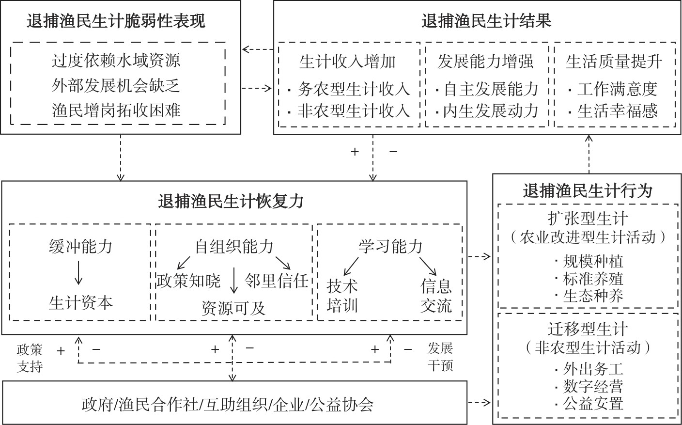 提升长江退捕渔民生计恢复力是防范和避免生计转型中致贫返贫倾向的关键。文章以湖北、湖南和江苏3省14个县域的退捕渔民为研究对象,以恢复力—可持续生计分析框架为理论基础,构建长江退捕渔民生计转型后多维相对贫困指标测度体系,实证检验生计恢复力对不同生计行为退捕渔民相对贫困的影响。采用Logistic回归模型测算生计恢复力不同维度层下属指标对退捕渔民“扩张型”生计和“迁移型”生计行为减贫效应影响显著性及具体程度,并借助解释结构模型和交叉矩阵相乘法进一步探索显著性影响因子的关联层次结构和逻辑机理。结果表明:①退捕渔民生计恢复力能够有效缓解扩张型和迁移型生计行为下的相对贫困,即对渔民生计行为减贫效应有显著影响。在进行内生性处理和稳健性检验后,该结论依旧成立。②不同禀赋特征对退捕渔民减贫效应的影响具有异质性。影响显著的自组织能力和学习能力指标对扩张型行为减贫的边际效应高于迁移型生计行为,就缓冲能力而言,扩张型生计行为减贫效应需要较多自然资本和人力资本支持,迁移型生计行为则更依赖于金融资本和社会资本。③退捕渔民生计行为减贫效应的显著影响因子共12个,可划分为3个层次。在“扩张型”生计行为中,退捕渔民健康状况和拥有的自然基础是深层驱动力因素;而“迁移型”生计行为中,退捕渔民教育水平和金融资本积累是深层依赖性因素。