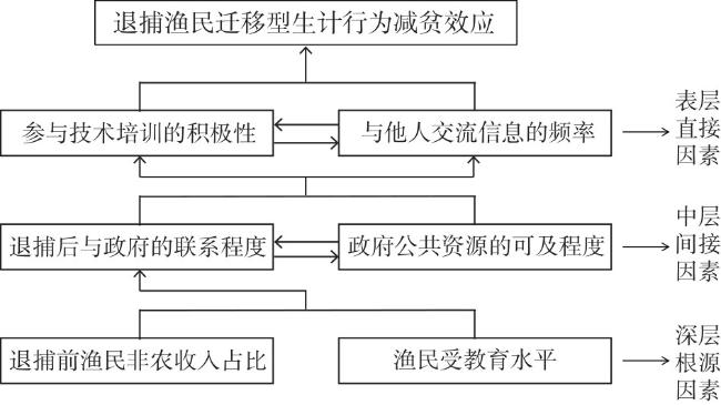 Enhancing the livelihood resilience of fishermen affected by the ban on fishing in the Yangtze River is crucial for preventing and avoiding tendencies toward poverty and re-poverty during livelihood transitions. To elucidate the complex relationship between livelihood resilience and the poverty alleviation effects of fishermen's livelihood behaviors, this study focuses on fishermen from Hubei, Hunan, and Jiangsu provinces who have been impacted by fishing bans. Grounded in a resilience-sustainable livelihoods analytical framework, we construct a multidimensional relative poverty measurement system for post-transition fishermen's livelihoods. We empirically examine how livelihood resilience influences relative poverty among fishermen engaged in different types of livelihood activities. Using a Logistic regression model, we assess the significance and extent to which various indicators under different dimensions of livelihood resilience affect the poverty alleviation effects associated with "stepping-up" and "stepping-out" livelihoods. Furthermore, we employ an explanatory structural model along with cross-multiplication methods to explore the hierarchical structure and logical mechanisms underlying significant influencing factors. The results indicate that: 1) The livelihood resilience of retired fishermen can effectively alleviate relative poverty under both stepping-up and stepping-out activities. Thus demonstrating a significant impact on their poverty alleviation efforts. This conclusion remains valid even after addressing endogeneity issues and conducting robustness checks. 2) The influence of differing endowment characteristics on fishermen's poverty alleviation effects exhibits heterogeneity. Notably, self-organization ability and learning ability—both significant indicators—have greater marginal effects on reducing poverty through stepping-up behaviors compared to stepping-out ones. In terms of buffering ability, stepping-up livelihoods require substantial support from natural capital and human capital, while stepping-out livelihoods are more reliant on financial capital and social capital. 3) The livelihood behaviors of fishermen have a significant impact on poverty alleviation, with a total of 12 specific influencing factors that can be categorized into three levels. In the "stepping-up" livelihood behavior, the health status of fishermen and their access to natural resources serve as deep driving force factors. In the "stepping-out" livelihood behavior, the education level of fishermen and the accumulation of financial capital are identified as deep dependency factors.
