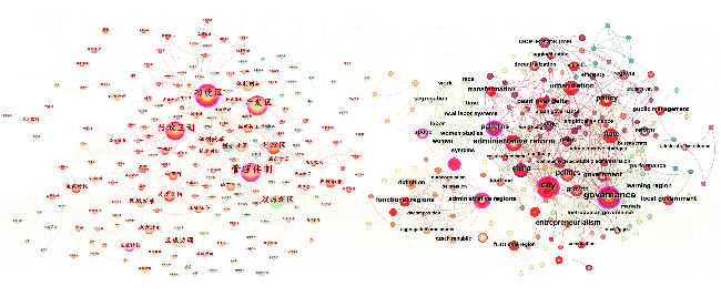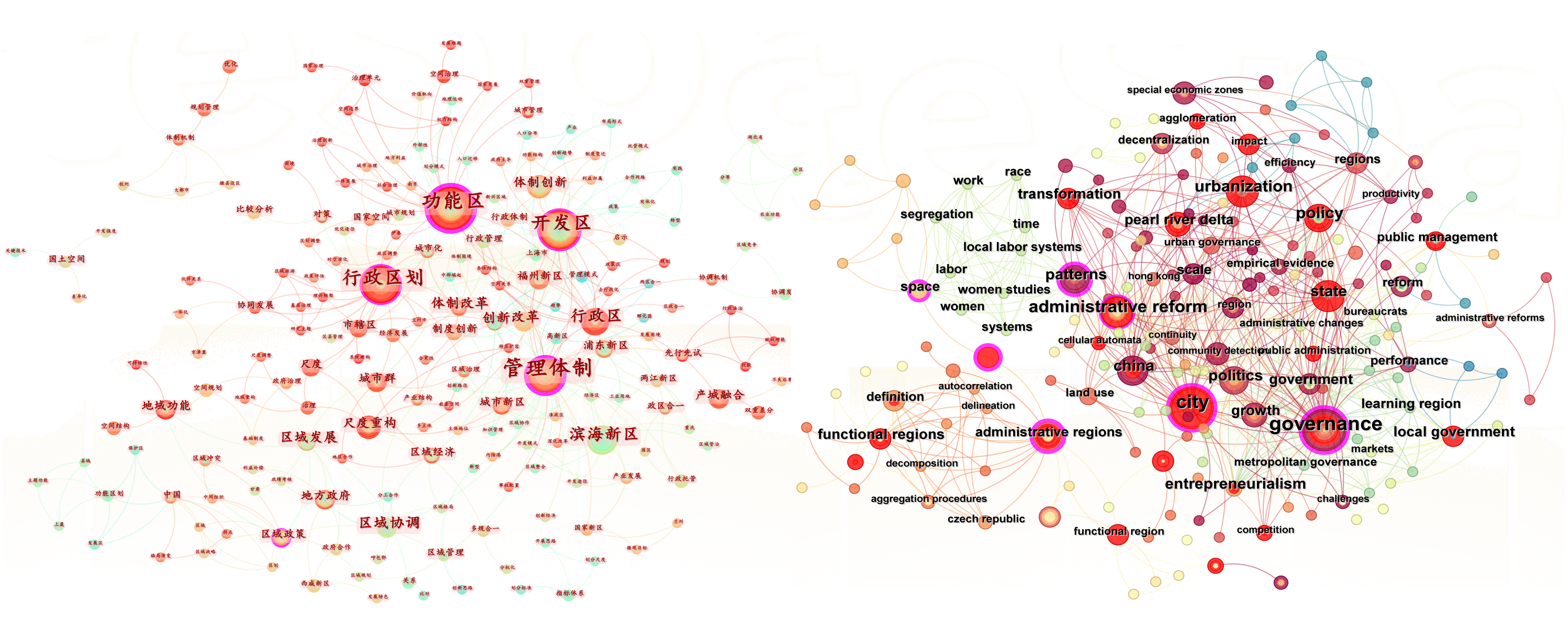 图3 1993—2023年中外功能区与行政区相关研究的作者与机构组合Fig.3 Author and institution collaboration graph of domestic and foreign studies on functional zones and administrative districts from 1993 to 2023 |