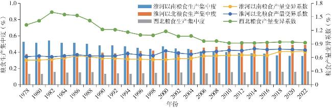 To reveal the "geographical code" behind the spatial evolution of China's grain production, this study divides China into three regions—south of the Huai River, north of the Huai River, and the northwest—based on two critical geographical boundaries: the Qinling-Huai River Line and the Hu Huanyong Line. Within this "two-line three-region" spatial framework, provincial grain production data from 1978 to 2022 are analyzed using dynamic analysis, spatial analysis, and econometric modeling to investigate the spatiotemporal evolution and driving mechanisms of China's grain production. The results show: 1) The spatial transition of grain production exhibits two features: "crossing lines" and "challenging lines." The "crossing lines" phenomenon refers to the northward shift of the grain production center of gravity, crossing the Qinling-Huai River Line, while the "challenging lines" phenomenon reflects a westward shift, with provinces in the northwest entering the coverage of the standard deviational ellipse of grain production, challenging the Hu Huanyong Line. 2) The high-high clustering areas of grain production in China are concentrated in the region north of the Qinling-Huai River Line; the low-low clustering areas are distributed west of the Hu Huanyong Line; the high-low and low-high clustering areas are located along the southern and northern segments of the Hu Huanyong Line, respectively, spanning the line. 3) Geographical disparities between the "three regions" divided by the "two lines" drive changes in grain production patterns. The "first nature" (natural conditions) shaped the early pattern of "south-to-north grain transfer" in China's grain production system, while the "second nature" (socio-economic conditions) has driven the restructuring of the "north-to-south grain transfer" pattern. These findings underscore the need to implement differentiated national food security strategies tailored to the characteristics of each "line-divided region."