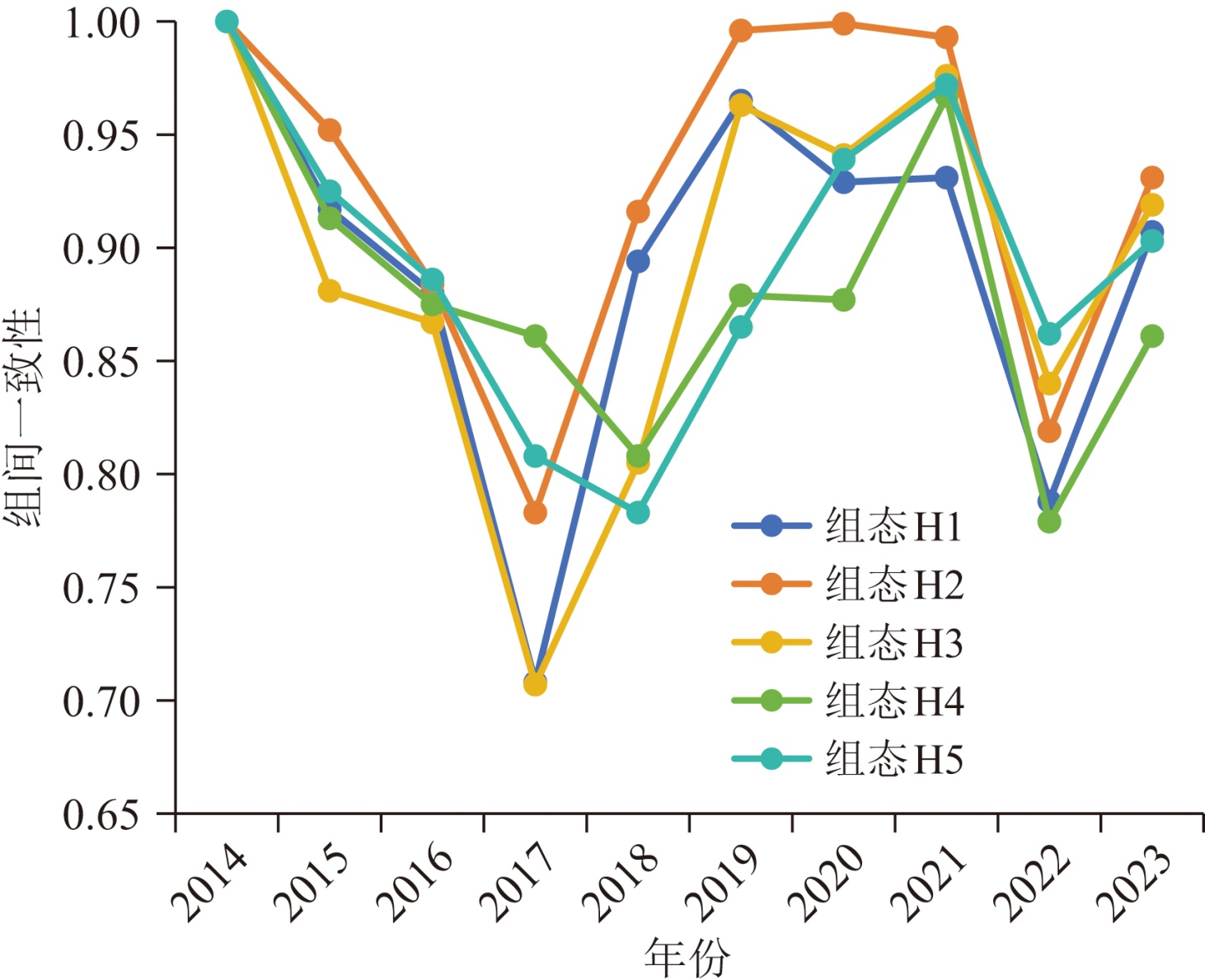 | 组间一致性调整距离 | 0.029 | 0.025 | 0.030 | 0.022 | 0.023 |