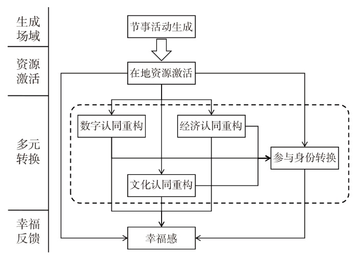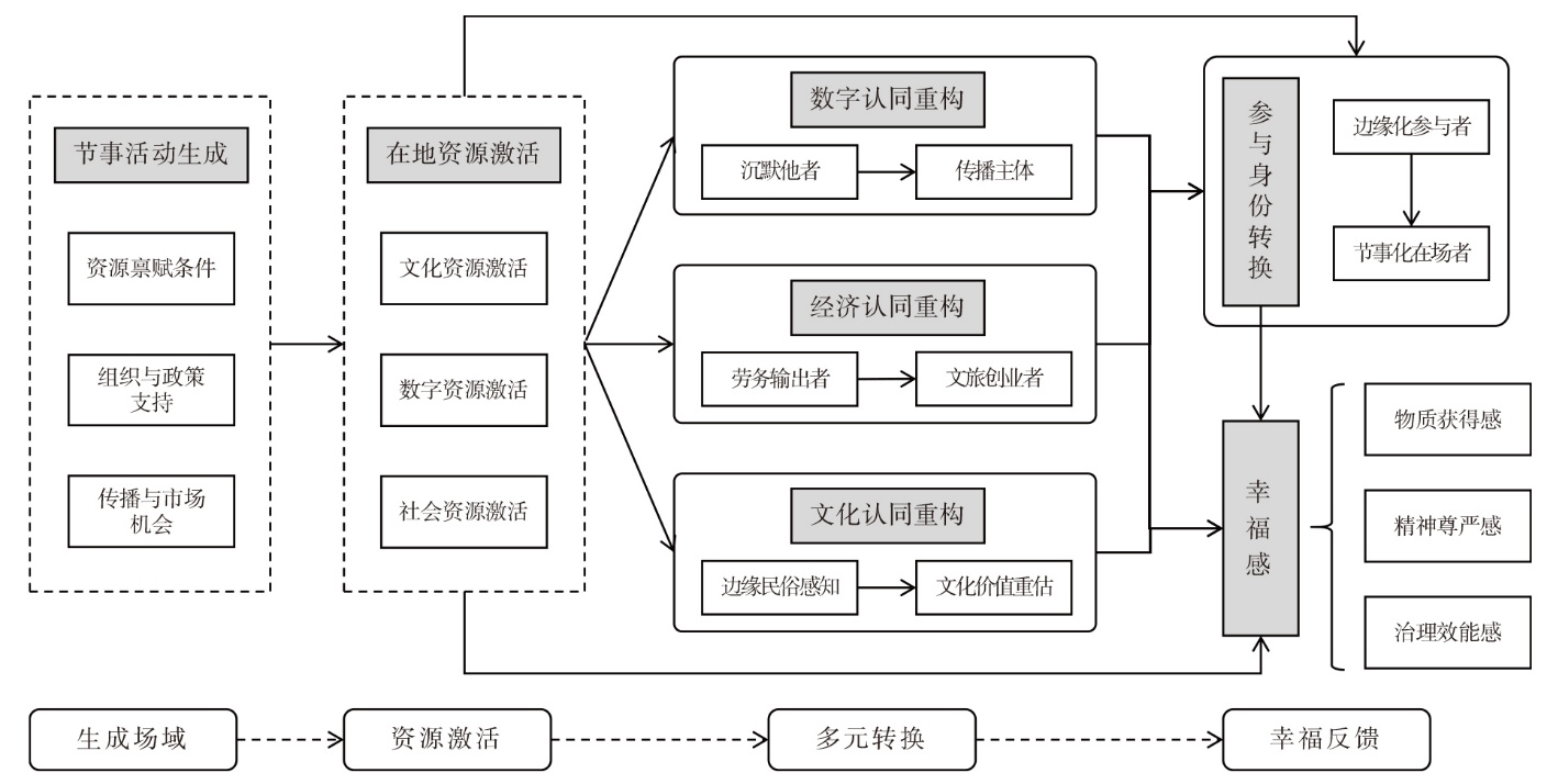 文章聚焦具有自组织性与数字传播特征的乡村新型节事,以贵州榕江“村超”为例,运用扎根理论构建“生成场域—资源激活—多元转换—幸福反馈”的四阶段生成机制模型,探析了新型节事活动如何促进乡村居民幸福感生成的多层次路径。研究发现:①在地方文化资源禀赋、政策支持与媒介扩散的协同作用下,“村超”实现了从日常性赛事向具有公共性、仪式性与动员力的节事活动转型;②文化、数字与社会资源在节事平台中被系统激活与整合,推动了社区增权、权力再配置与空间正义实践;③在数字、经济与文化3个维度,居民完成了认同重构与身份转换,表现为从“沉默他者”到“传播主体”、从“劳务输出者”到“文旅创业者”、从“边缘民俗感知”到“文化价值重估”的多元转换;④居民在物质获得感、精神尊严感与治理效能感3个维度实现幸福感生成,并在风险与机遇的张力中展现出个体化、多样化的生成路径。
