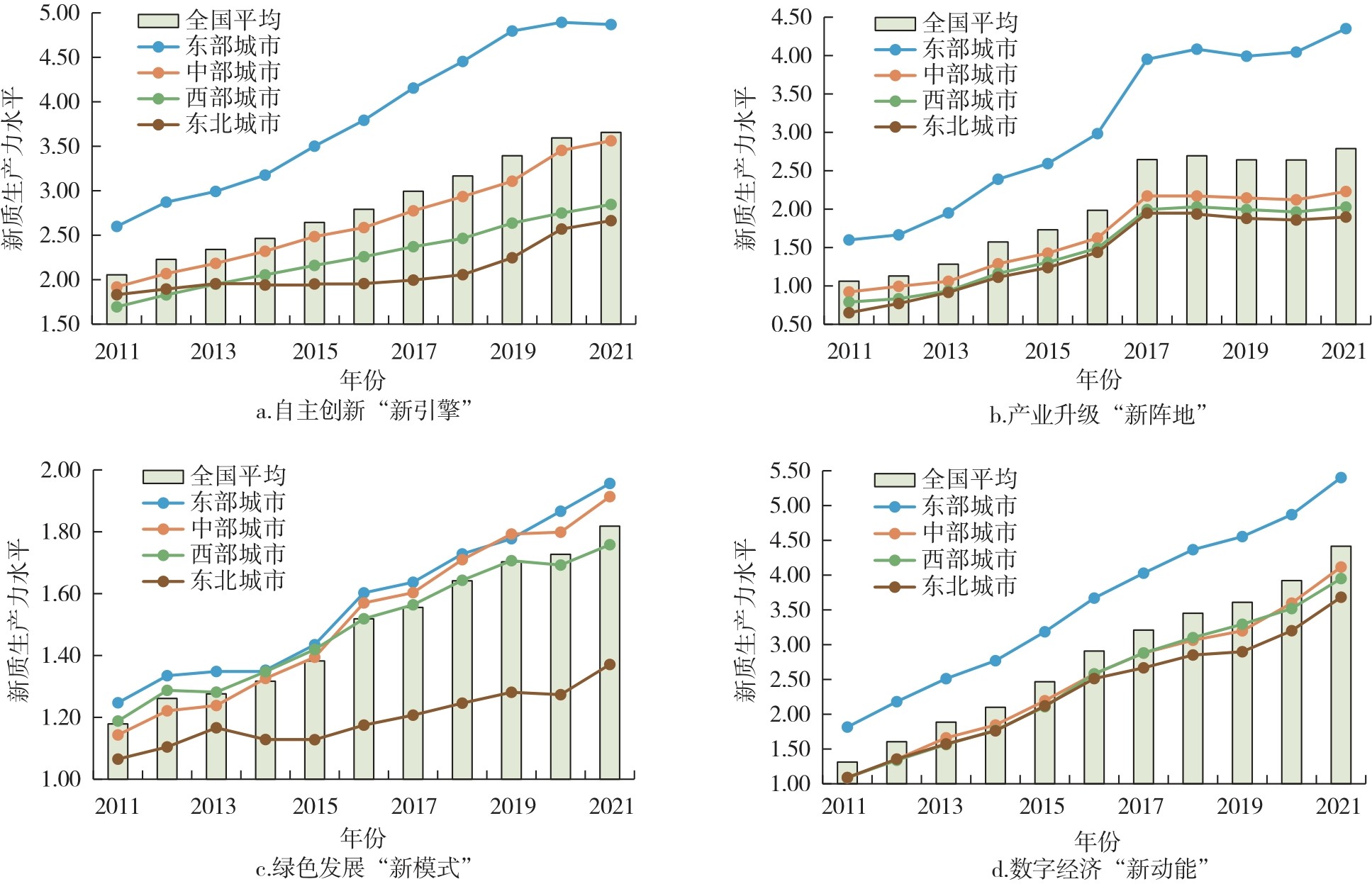 2011—2021年全国及四大区域新质生产力水平分维度的演进趋势