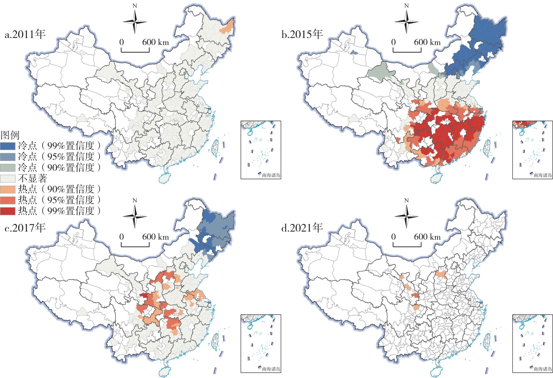 典型年份中国288个城市的经济韧性冷热点空间分布