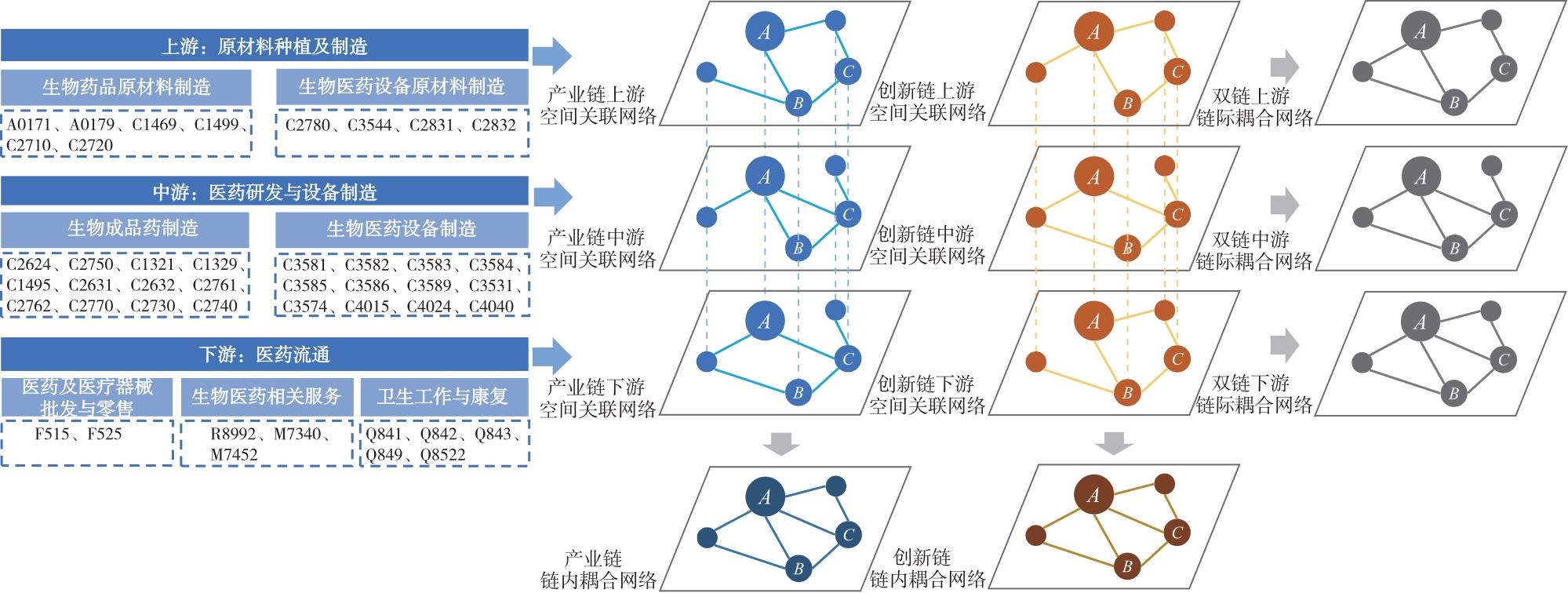 Based on the headquarters' branch data and patent cooperation data, this paper constructs the spatial correlation network of the biomedical industry chain and innovation chain (hereinafter referred to as "dual chains") in the Yangtze River Delta, uses the multivariate network coupling model to identify its coupling characteristics, and introduces the weighted link between specific cities through the system to promote the production spatial correlation network to approach the Pareto optimal state. The results show that: 1) In terms of spatial pattern, the industrial chain presents a strong triangle linkage of the "Shanghai-Jiangsu-Zhejiang", while the innovation chain shows a unipolar leading "core-edge" structure taking Shanghai as the core. 2) In terms of the coupling characteristics, weak coupling is dominant within the industrial chain, especially in the manufacturing of APIs and preparations. The strong coupling characteristics within the innovation chain are significant, but the technical innovation barriers are still high. In terms of the inter-chain coupling of "dual chains", the upstream basic research is disconnected from the innovation of raw materials, there are "three low" bottlenecks in the midstream clinical transformation and device autonomy, and the efficiency of downstream market access and capacity allocation is not high. 3) The optimization path simulation reveals that improving the internal coupling of the innovation chain is the key to the gain of network efficiency. Industrial collaboration and innovation integration need to be promoted in stages, while the spiral dimension of dual chain conjugation needs to continue to strengthen the link cultivation mode of "supporting the strong with the weak", especially the coupling strength of the finished drug link in the middle reaches of the "dual chains".