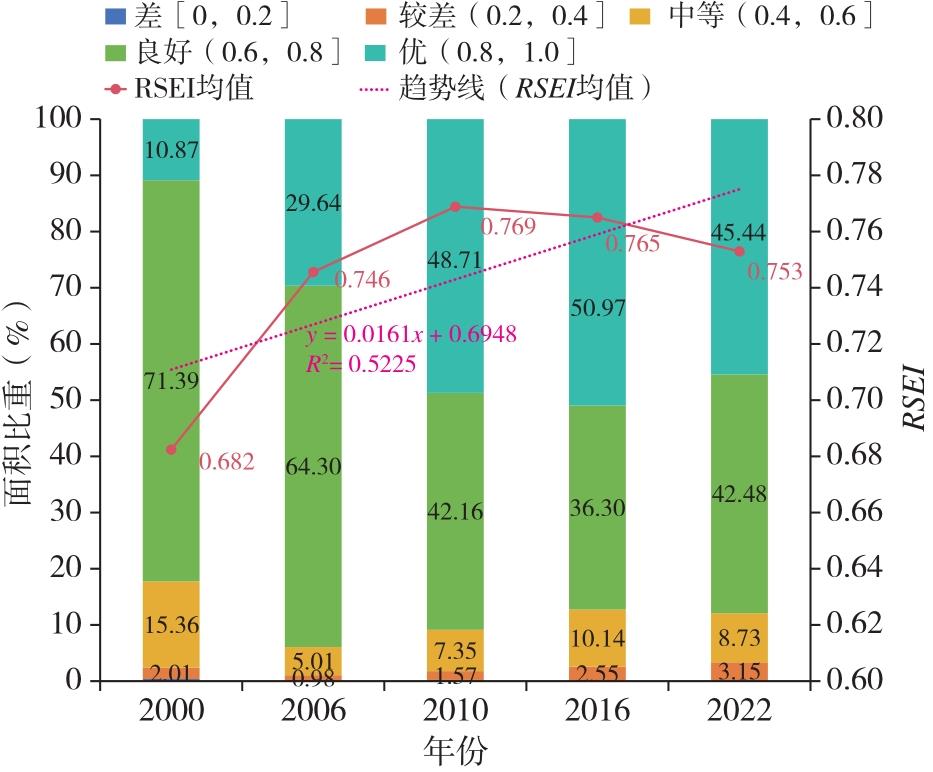 Taking Shishou City as the research object and based on the Landsat5, 8, and 9 remote sensing data from 2000 to 2022, this study calculates greenness index, heat index, humidity index, and dryness index on the basis of Google Earth Engine, and constructs the Remote Sensing based Ecological Index (RSEI), which aims to dynamically monitor the changes in the ecological quality of Shishou City and identify the priority areas for ecological restoration. It uses the methods of spatial statistics and landscape pattern index to explore the spatial and temporal changes and aggregation characteristics of ecological quality in Shishou City. The results show that: 1) The average values of remote sensing ecological index in Shishou City were 0.682, 0.746, 0.769, 0.765 and 0.753 in the five time periods from 2000 to 2022, which were all at the level of "good" or above. 2) The ecological quality of Shishou City in the five periods was "excellent" and "good" in a wide range of areas, accounting for a large proportion. 3) From 2000 to 2010, the ecological quality of Shishou City improved more and degraded less. From 2011 to 2022, the ecological quality of Shishou City improved and degraded basically the same. 4) The Moran's index in Shishou City from 2000 to 2022 was 0.423, 0.550, 0.332, 0.340 and 0.543 in order, showing positive spatial correlation, with high-high clustering and low-low clustering predominating. 5) In the past two decades, the density of ecological quality landscape patches in Shishou City has tended to decrease, the shape of patches has tended to be regular, and similar patches have become more aggregated. The combination of RSEI and spatial statistical analysis is able to monitor the spatial and temporal changes of ecological quality, and identify priority areas for ecological restoration. The methods can provide certain reference for regional ecological security and ecological protection.