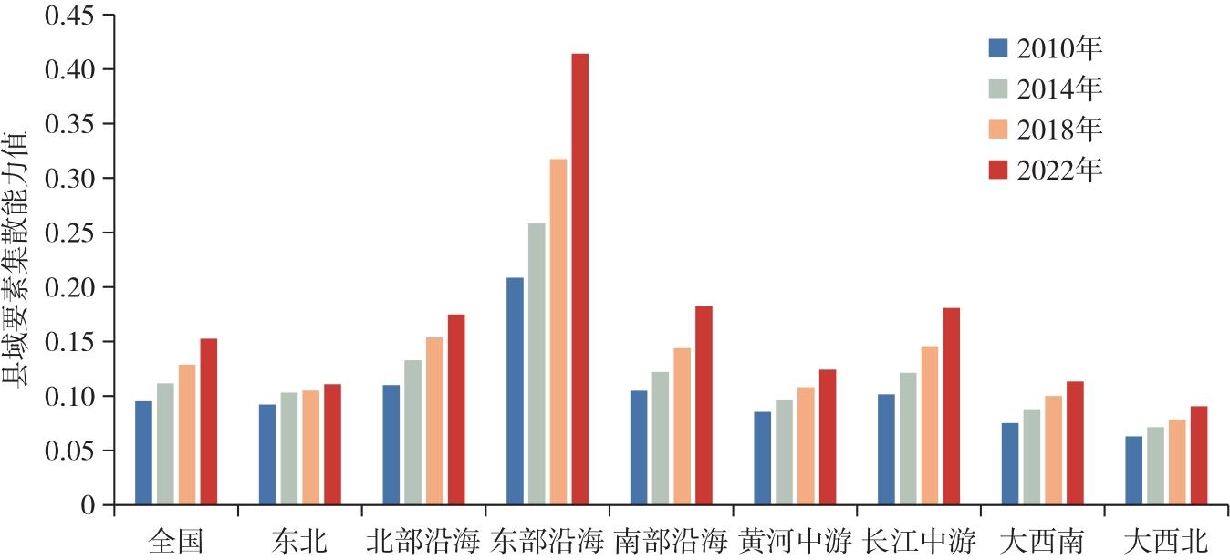 County-level factor agglomeration-diffusion capacity is a key driver for advancing urban-rural integration development. Integrating the methods of real-coded accelerating genetic algorithm and projection pursuit clustering model (RAGA-PPC), kernel density estimation, and Markov chain, this study examines the spatial pattern and multidimensional dynamic evolution of factor agglomeration-diffusion capacity across 1735 county-level units in China in 2010-2022. The results show that: 1) County-level factor agglomeration-diffusion capacity shows the steady upward trend. There are significant gradient differences among eight comprehensive economic zones, the eastern coastal economic zone remains persistently at the forefront, whereas the northeastern economic zone exhibits relatively weak development. 2) Factor agglomeration-diffusion capacity displays a clear core-periphery configuration: hotspot areas are stably concentrated in the coastal economic zones and the economic zone of the middle reaches of the Yangtze River, while coldspot areas are primarily located in the economic zone of middle reaches of the Yellow River and the greater southwestern economic zone, with their spatial extent gradually contracting. 3) The overall disparities of factor agglomeration-diffusion capacity continue to widen, with interregional differences constituting the dominant source, the disparity between the northeastern economic zone and other economic zones is more significant, while the internal disparity within the greater northwestern economic zone is the smallest. 4) Factor agglomeration-diffusion capacity exhibits strong state persistence, and there is a long-term spatial influence among adjacent counties. Over time, the phenomenon of low-low clustering gradually eases, and the upward mobility trend strengthens. High-level counties exert a pronounced siphoning effect on low-level counties, while generating spillover-driven diffusion effects for medium-level and other counties. These findings provide theoretical foundations and policy-relevant evidence for optimizing county-level factor allocation and promoting urban-rural integration development.