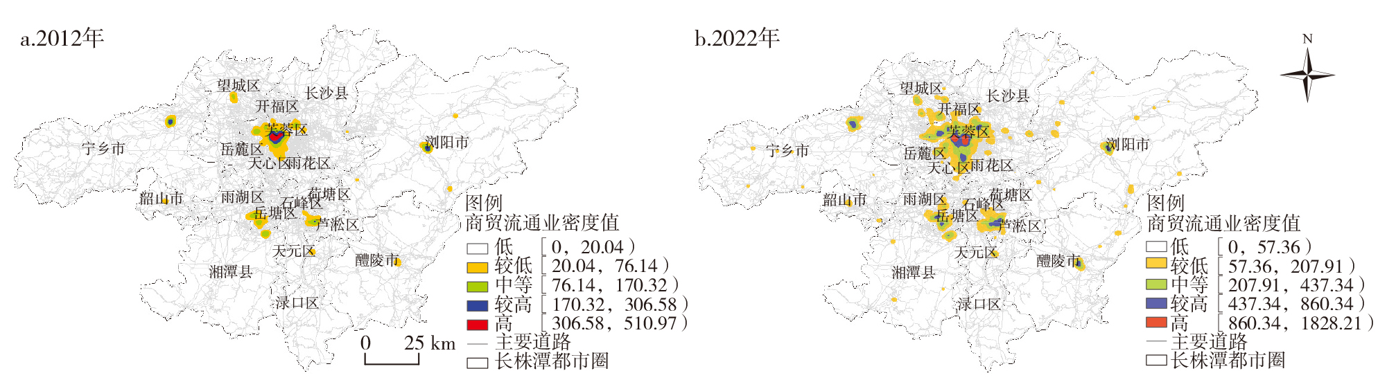 Based on the POI data and socio-economic data from the Changsha-Zhuzhou-Xiangtan Metropolitan Area, this study comprehensively employs methods such as kernel density analysis, standard deviation ellipse, two-way fixed effects model, and geographical detectors to investigate the spatiotemporal characteristics and driving mechanisms of the commercial trade and circulation industry in 2012-2022. The research reveals that: 1) The spatial development model of the commercial trade and circulation industry in the Changsha-Zhuzhou-Xiangtan Metropolitan Area has undergone a profound transformation from a core-periphery structure to a functional-network structure, which is specifically manifested as follows: the spatial pattern has evolved from a single-core concentric structure to a multi-center symbiotic network structure, with sustained expansion along the northwest-southeast axis, forming a multi-level system of "core leadership-secondary center support-node diffusion. 2) The sub-sectors of the commercial trade and circulation industry exhibit differentiated evolutionary characteristics, with spatial correlations shifting from homogeneous agglomeration to functional synergy. Specifically, the wholesale and retail industry spreads along the development axis and tends toward multi-directional equilibrium, the catering industry agglomerates toward the core area with a contracting spatial scope, while the accommodation industry shows a decentralized distribution. Spatial correlations among industries have diverged, with the wholesale and retail industry maintaining strong synergy with the catering industry, whereas the correlation with the accommodation industry has significantly weakened. 3) The spatiotemporal evolution is driven by the synergy between government and market forces. The government guides the transformation of the spatial structure through institutional supply, while market-driven factors shift from the supply-side economic foundation to the demand-side urbanization, forming an interactive supply-demand composite mechanism. Therefore, it is recommended to further optimize the functional layout of the metropolitan area, strengthen regional and industrial linkages, and improve market-government collaboration to promote the quality and efficiency enhancement of the commercial trade and circulation industry and achieve coordination development of the metropolitan area as a whole.