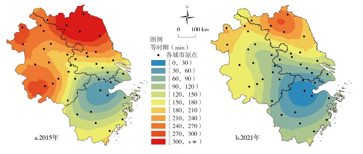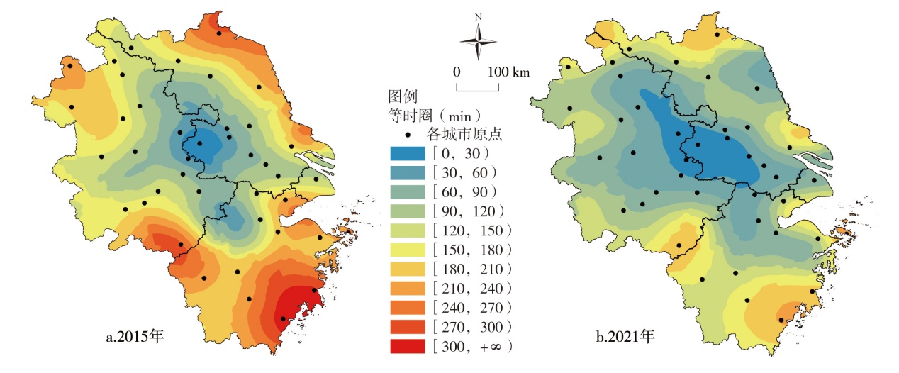 From the perspective of regional spatiotemporal compression,this article constructs a comprehensive transportation accessibility model to measure the shortest time distance and its changes between 41 municipal-level cities in the Yangtze River Delta region. Based on the methods of Delphi and isochronous circle,this article explores the spatial heterogeneity of the integration level of the Yangtze River Delta urban agglomeration from the three dimensions of municipal level,metropolitan level and urban agglomeration level,which provides a reference basis for the formulation of integration plans and policies in the Yangtze River Delta region. The main findings are as followings: 1) In the context of traffic integration construction,the construction and opening of high-speed railway and inter-city railway have significantly shortened the time distance between cities,made the intercity social and economic exchanges more close,and the number of city pairs within one hour has increased sharply. 2) The regional high-level integration areas are concentrated in the Shanghai-Nanjing axis belt and Shanghai-Hangzhou axis belt,the integration level of cities along the Yangtze River Economic Belt is high. 3) Under the spatiotemporal compression effect,regional central cities expand the geographical scope of "spillover effect" and "one-city effect". 4) The spatial heterogeneity of integration in the Yangtze River Delta region has changed with the continuous improvement of the high-speed transportation network. Cities such as Hangzhou,Wuxi,Suzhou,and Hefei have gradually become emerging core cities in the Yangtze River Delta region,and the role of cities such as Wuhu and Anqing in the urban network is also gradually strengthening.