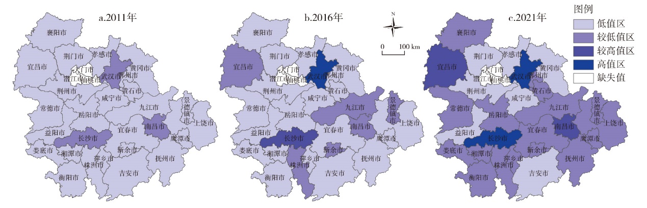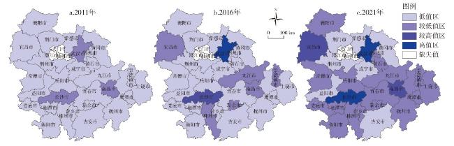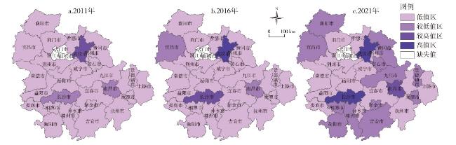 图2 2011、2016、2021年长江中游城市群新型城镇化的时空特征Fig.2 Spatio-temporal characteristics of new-type urbanization of urban agglomerations in the middle reaches of the Yangtze River in 2011,2016,and 2021 |