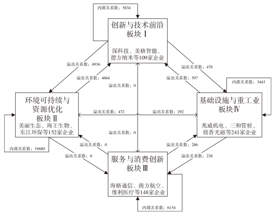 | 板块 | 接受关系数(条) | 企业数 (个) | 接收板块外关系数 (条) | 溢出板块外关系数 (条) | 总体关联 结构特征 | 板块角色 特征 | |||