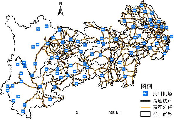 枢纽影响力 | 按照i城市行政中心与最近民用机场的距离D分段计分。若D≤30 km,计2分;30 km<D≤60 km,计1分;60 km<D,计0.5分 |