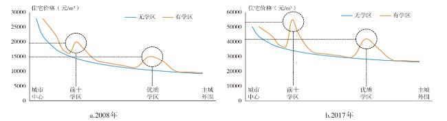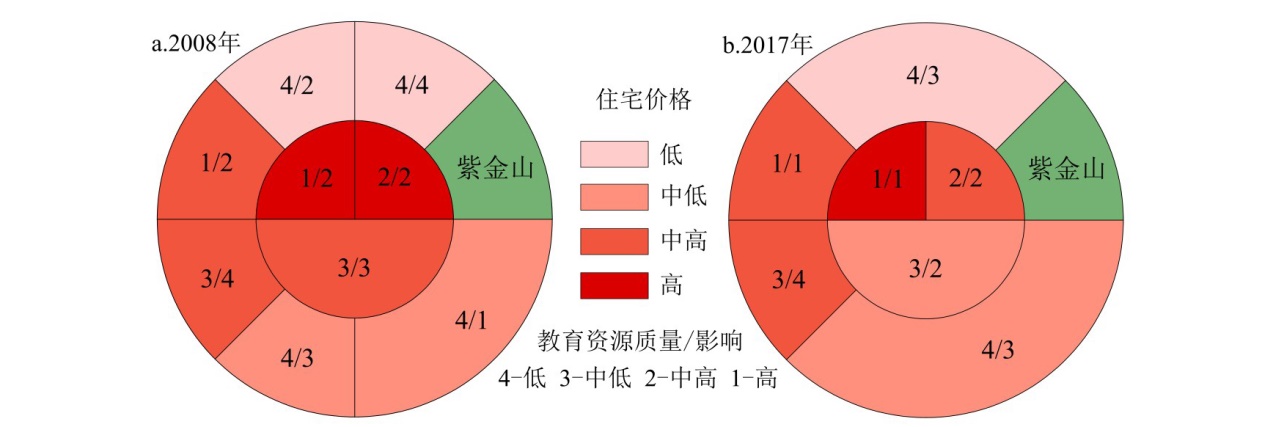 Education equity is one of the hot issues in China's social transformation period. This study takes the main urban area of Nanjing as an research area and selects the public primary school and residence community in 2008 and 2017 as the research object. Based on the hedonic price model and geographically weighted regression (GWR) model, this study analyze the effect and degree of location characteristics, architectural characteristics, school district characteristics, and neighborhood characteristics on housing price, and explores the spatial heterogeneity of the impact of educational resource quality on housing price. The results of this study indicate that: 1)The housing price in the main urban area shows the decreasing characteristics from the top-level prestigious school district to the periphery, it changes the core-edge structure of the urban housing price. 2)The influence of acceptance rate of Nanjing Foreign Language School(junior high school) on housing price rises from the third to the first in the main urban area, and has significant spatial heterogeneity on housing price. 3)With the increasing spillover effect of quality educational resources on the housing price of the school district, the demand for economic capital in quality school district is increasing, it triggers many social problems such as residential differentiation, educational alienation and class solidification. The spatial and temporal effects of school district housing caused by the uneven spatial distribution of quality education resources have affected education and social equity. It is of great social significance to formulate policies and measures to optimize quality education resources.