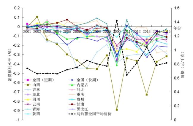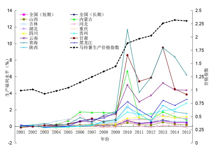 Based on the panel data in the main production area and the national data of the potato from 2001 to 2015, this paper calculates farmers' production welfare effect, consumption welfare effect and general welfare effect of potato price fluctuation. It is used to evaluate the poverty reduction effect of potato industry. The research results show that: 1) The impact of potato production price fluctuation on the increase of the farmers' production welfare is greater the impact of potato sale price fluctuation on the decrease of farmers' consumption welfare, the trend of farmers' general welfare is similar to the production welfare. 2) There are differences in farmers' total welfare among the provinces in the main producing areas, which are mainly determined by the influencing factors of farmers' production welfare. The potato production price is the main factor that affects farmers' production welfare. The support policy for potato industry causes the increase of the production price and the total welfare of farmers, the poverty reduction effect is significant. 3) With the increasing demand for potatoes, the impact of price fluctuations on farmers' total welfare will gradually increase. In addition, the proportion of labor costs in production costs has been increasing in recent years. As a result, the potential to improve the farmers' total welfare by raising production prices will gradually decrease, and the poverty reduction effect will also gradually decrease.