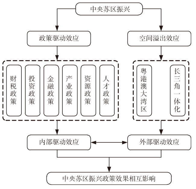 "Gratitude for the source of benefit" means that we shouldn't forget the people of old revolutionary base areas and support the development and revitalization of the central Soviet area. Based on the quasi-natural experimental environment formed by the Central Soviet Area revitalization policy in 2013,this article made a double difference test in the Central Soviet Area (City and District) of Jiangxi,Fujian,Guangdong,it was found that the revitalization of the Central Soviet Area was the result of the policy-driven effect,the spatial spillover effect of the Guangdong-Hong Kong-Macao Bay area and the Yangtze River Delta integration. Further using Difference-in-Difference-in-Difference model to control the total spillover effect,it showed that the revitalization of the Central Soviet Area was mainly the result of the spatial spillover effect; and policy driven effect promote the revitalization of the Central Soviet Area through industrial policy and talent policy. In addition,the policy-driven effect had a significant revitalization effect on the Central Soviet Area of Guangdong,while the Central Soviet Area in Jiangxi and Fujian relied mainly on the spatial spillover effect. Therefore,this article put forward four policy recommendations: strengthening the national regional development strategy and regional spillover; speeding up the docking of the national strategy the Central Soviet Area,optimizing the environment for the Central Soviet Area to undertake; formulating industrial development plans reasonably,and improving the quality of basic education; fully grasping comparative advantages of the Central Soviet Area and paying attention to precise policy implementation.
