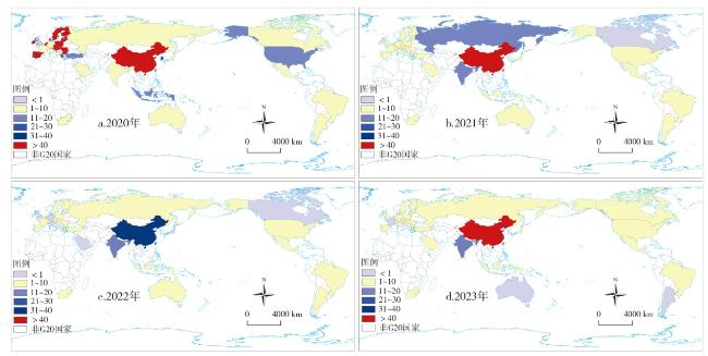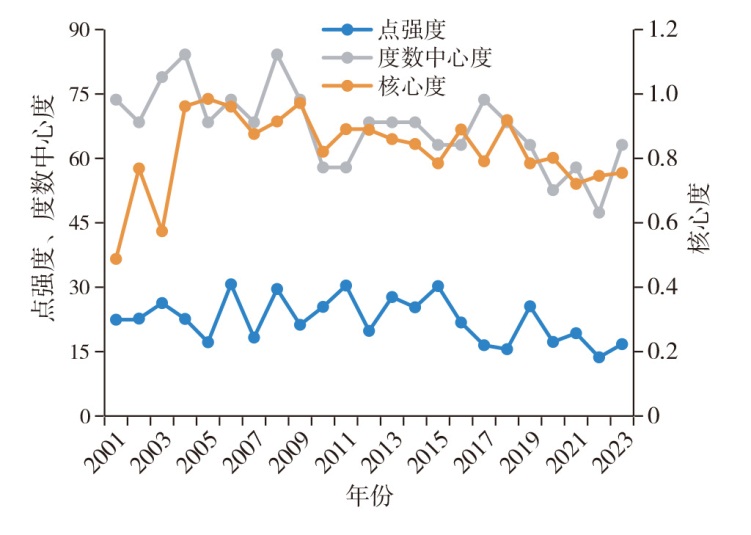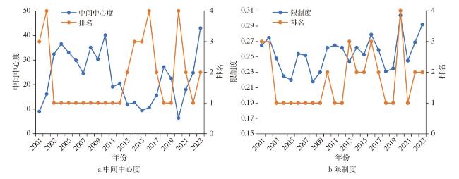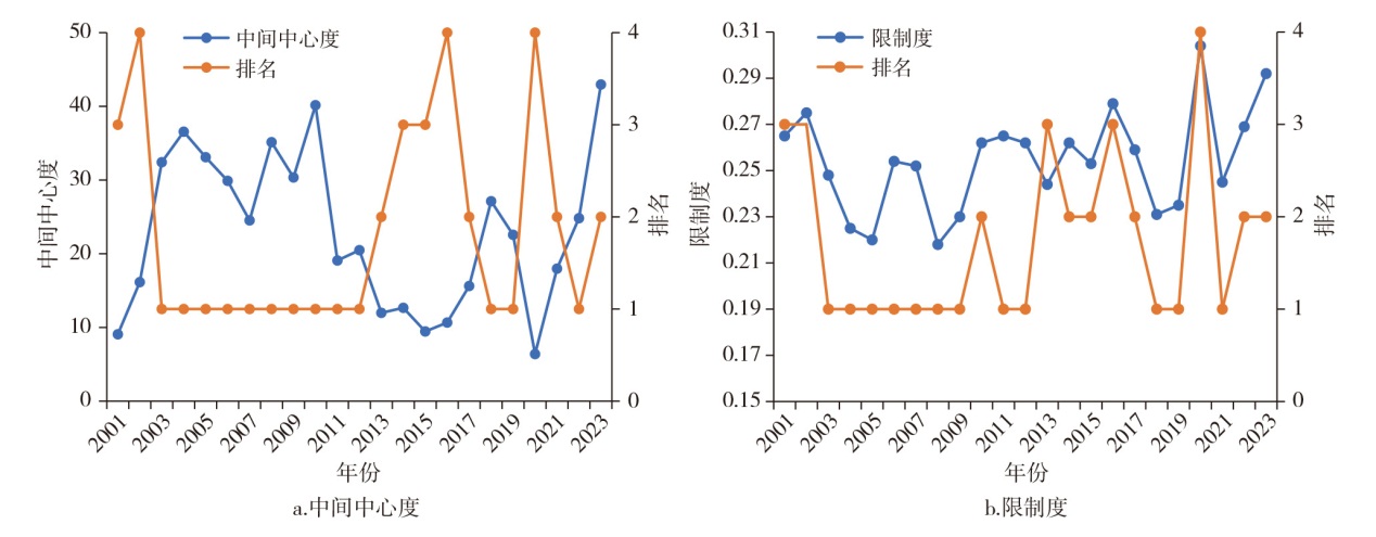 表1 G20贸易摩擦网络中心度排名前十成员Tab.1 Top 10 members in the centrality of G20 trade friction network ranks in 2001,2008,2017 and 2023 |