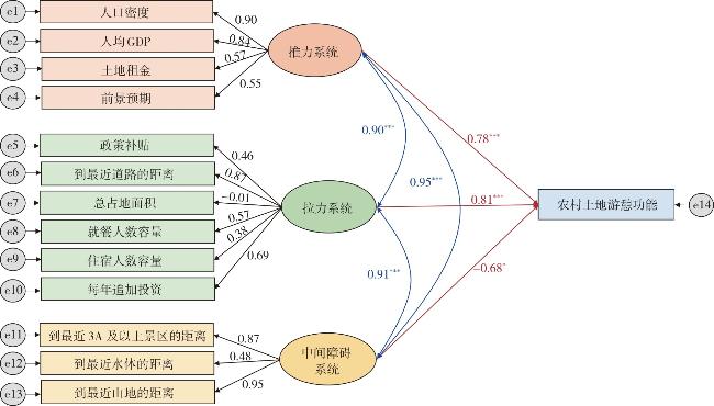 | H2:拉力→土地游憩功能 | 0.780 | 0.81 | 0.243 | 3.207 | *** | 支持 |
