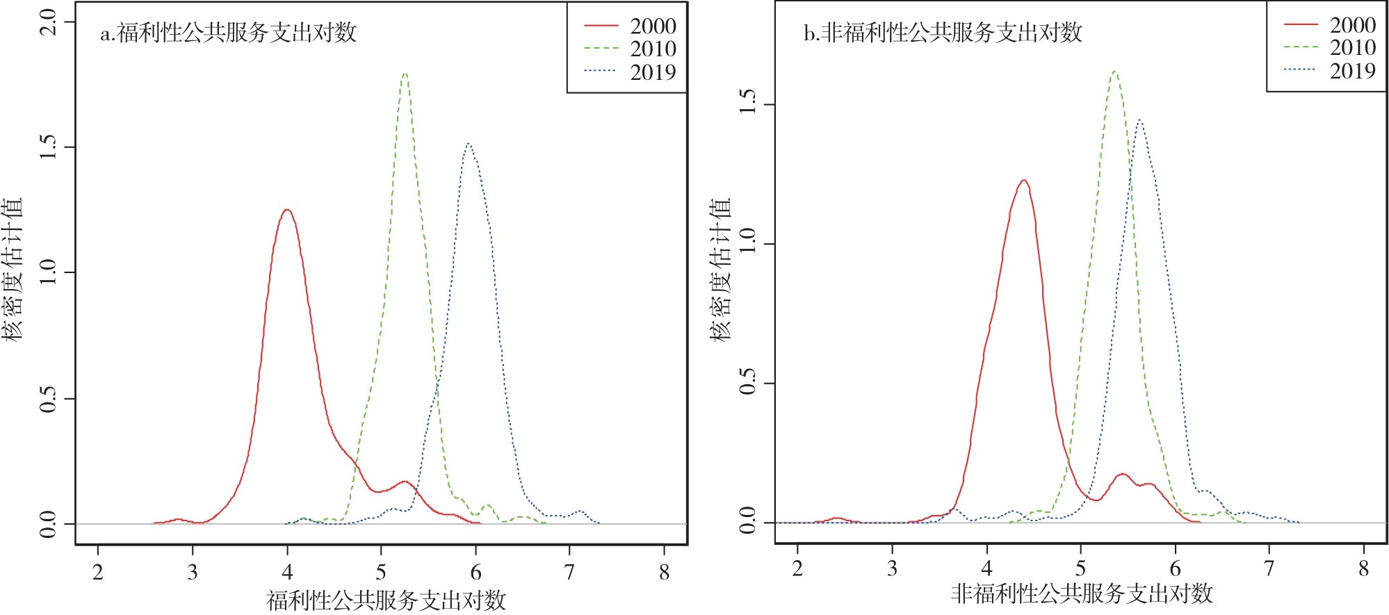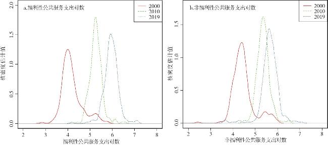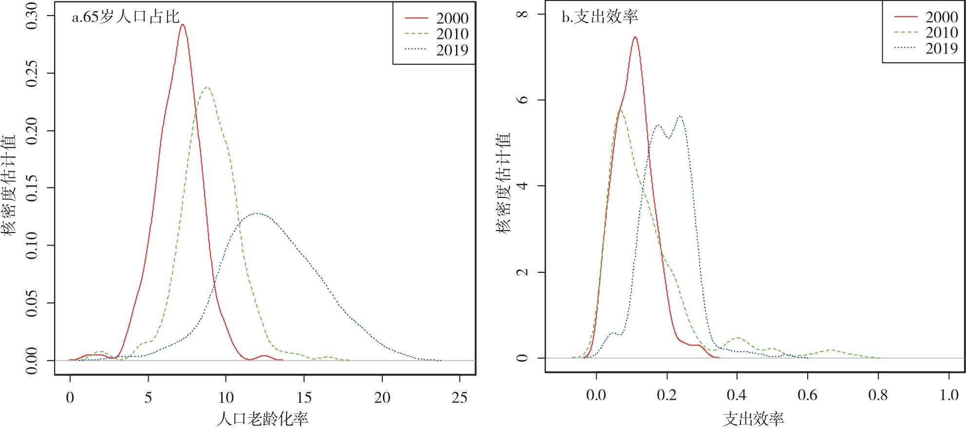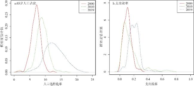 图1 人口老龄化水平和政府支出效率核密度估计结果Fig.1 Results of kernel density estimation of population aging level and government expenditure efficiency |