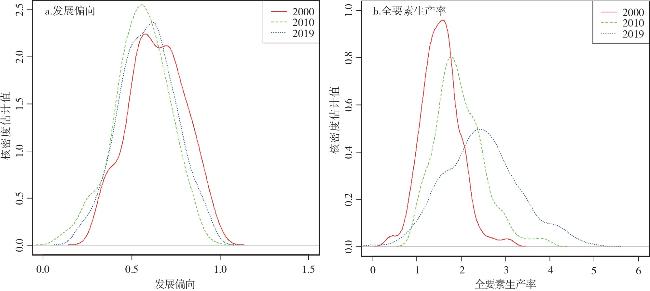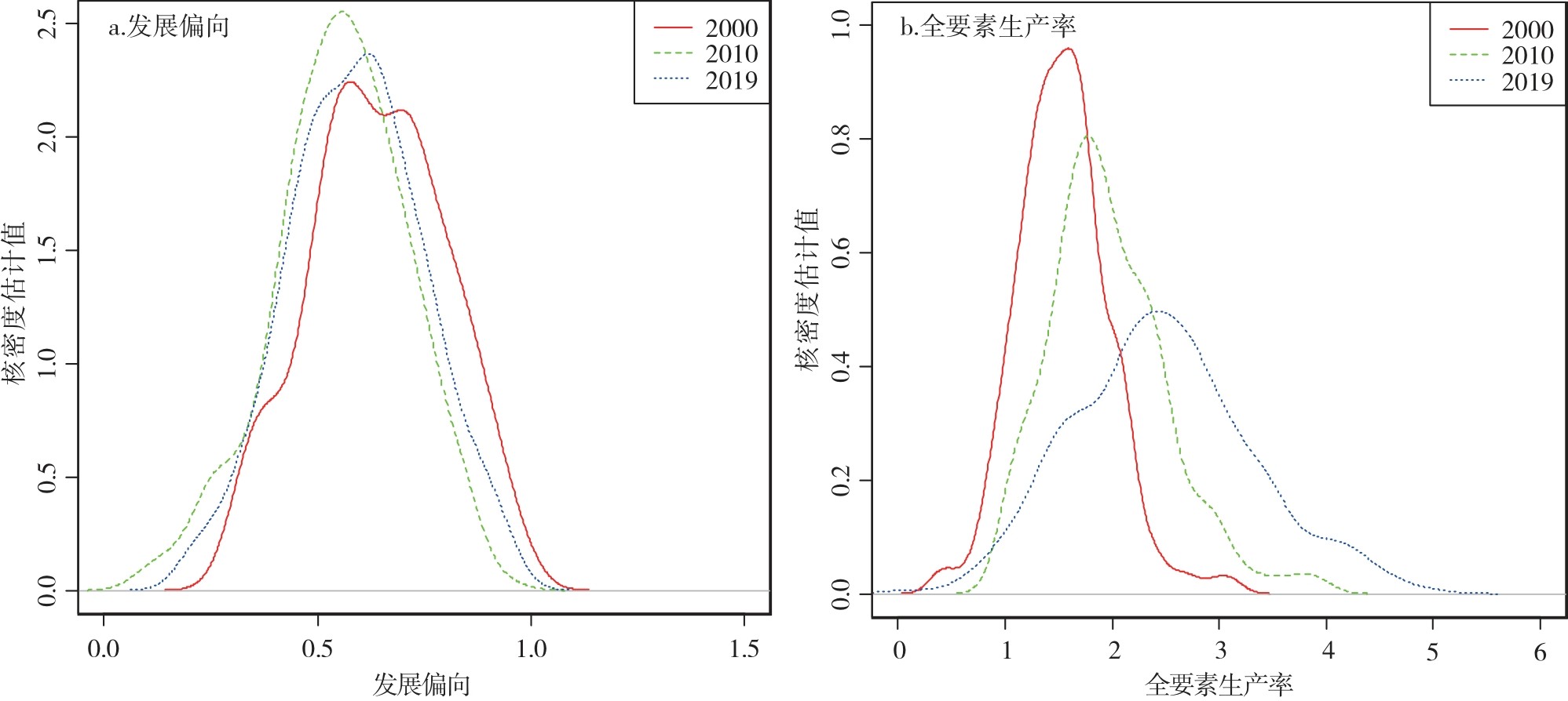 图2 城镇发展偏向与全要素生产率核密度估计结果Fig.2 Urban development bias and total factor productivity kernel density estimation results |