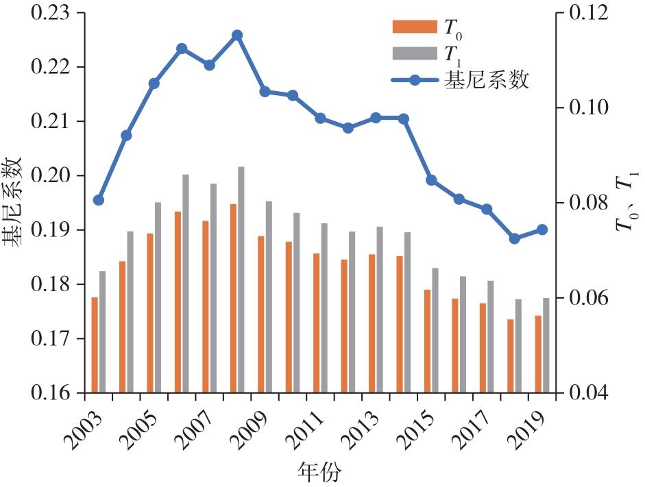 | 年份 | 基尼系数 | T0 | T1 | 基尼系数 增长率(%) | T0增长率(%) | T1增长率(%) |