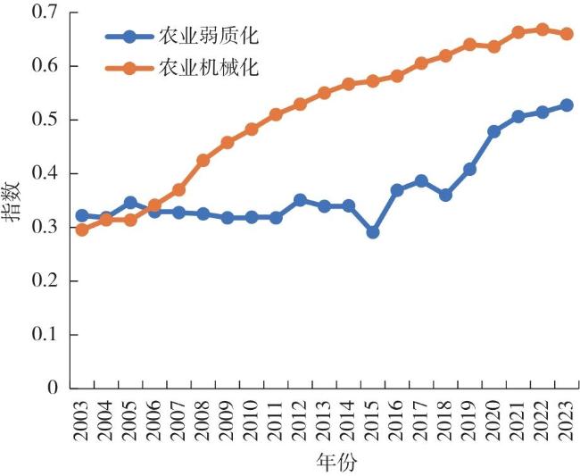 It is difficult to reveal the overall characteristics of the change of agricultural labor force and its coupling relationship with agricultural mechanization by focusing on the reduction or aging of agricultural labor force, feminization, childishness and low education. By constructing an evaluation index for agricultural labor force weakness and agricultural mechanization, this study quantitatively measured the development of agricultural labor force weakness and agricultural mechanization in China and its provinces from 2003 to 2023. Then, the coupling coordination degree model was employed to analyze the spatiotemporal evolution characteristics of the two systems, and the quadrant diagram model was further used to reveal the evolutionary pathways of provincial grain production under varying coupling coordination conditions. Finally, the spatial econometric model was used to quantitatively reveal the impact of the coupling coordination between the two and other agricultural production factors on China's grain production. The results showed that:1) The weakness of China's agricultural labor force showed a two-stage change from 2003 to 2023, with a fluctuating decline from 2003 to 2009 and a steady increase from 2010 to 2023, while the level of agricultural mechanization continued to improve. 2) In 2003, the coupling coordination degree of agricultural labor weakness and agricultural mechanization decreased from west to east. In 2009, the coupling coordination degree decreased from west to east and from south to north. In 2015 and 2023, the coupling coordination degree was degraded and greatly improved, respectively. 3) In the two periods from 2003 to 2009 and 2010 to 2015, the coupling coordination degree of agricultural labor weakness and agricultural mechanization decreased in more than 60% of provinces, but grain output increased, and the opposite was true in 2016 to 2023. 4) The improvement of the coupling coordination degree of agricultural labor weakness and agricultural mechanization in 2003-2009 and 2010-2015 had a significant positive spatial spillover effect on grain production, however in 2016-2023, the spatial spillover effect on grain production turned to significantly negative.