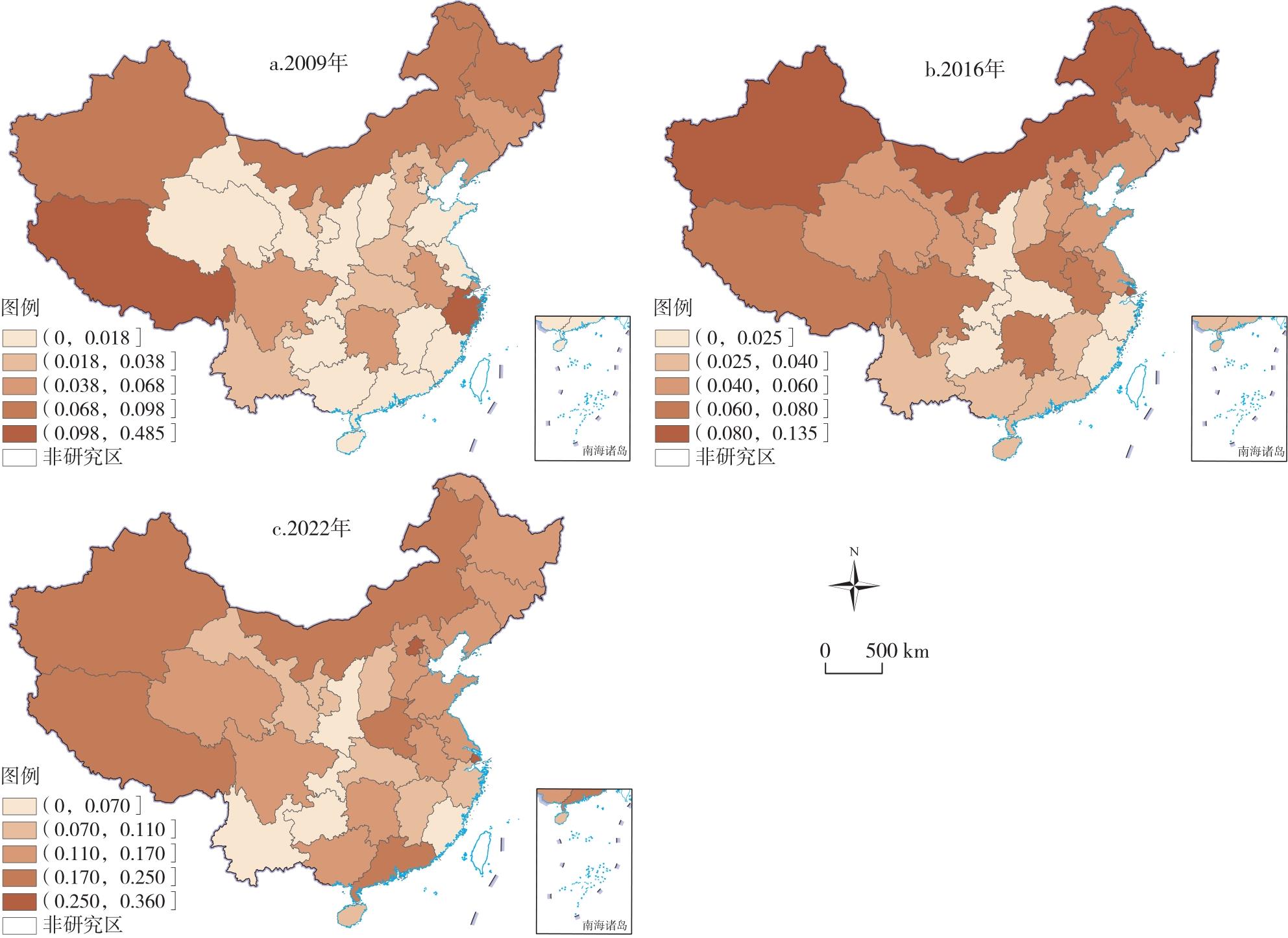 表2 2009、2016和2022年中国31个省份农业保险高质量发展指数排名Tab.2 Rankings of high-quality development index of agricultural insurance for 31 provinces in China in 2009, 2016, and 2022 |