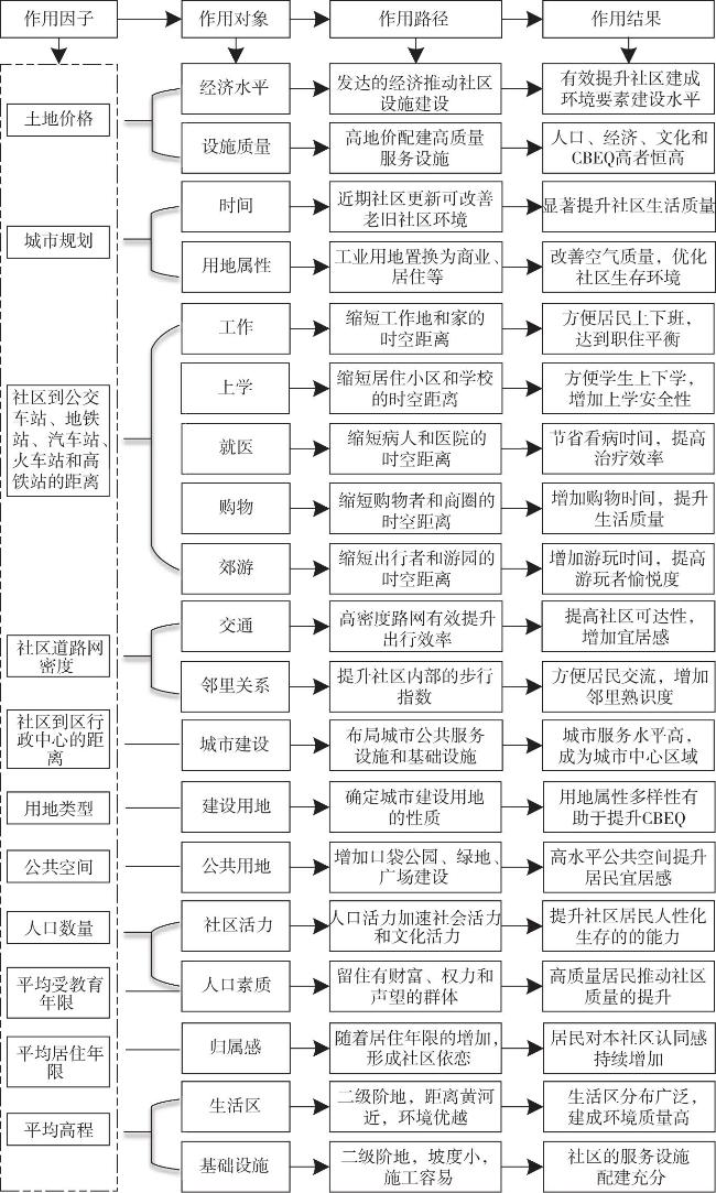 The improvement of people's quality of life and the solid promotion of common wealth in the new era are greatly supported by the important foundation of the high community built environment quality(CBEQ). In this paper, Lanzhou, the center city of Northwest China, is taken as an example, and the subjective evaluation index system of CBEQ under the perspective of common wealth is constructed based on the questionnaire data. The results show that: The distribution of CBEQ is significantly influenced by the Yellow River, displaying an east-west axial belt-like core-edge spatial characteristic. High-quality communities tend to be in close proximity to surrounding high-quality and higher-quality communities, forming a spatial aggregation phenomenon of high-quality communities. From a sub-dimensional perspective, the overall spatial distribution of environmental livability is balanced, but there is the phenomenon of inverse centralization. The convenience of life presents the spatial agglomeration characteristics of single-center and axial belt. Social stability forms the spatial distribution characteristics of single-center and dotted with the district government as the core. Spiritual affluence presents the spatial structure characteristics of multi-center of different levels. The primary factors, such as land price, urban planning, distance to the district administrative center, average years of education, and public space, have always played a fundamental role, while the secondary factors, such as distance to the station, population, distance to the subway station, density of the community's road network, type of land use, average years of residency, and average elevation, play a key role, and their interaction contributes to the formation of the spatial differentiation pattern of CBEQ. The interactions between them contributed to the formation of the spatial differentiation pattern of CBEQ. Among them, the force of land price, distance from the community to the subway station, distance from the community to the station, and public space continued to increase.