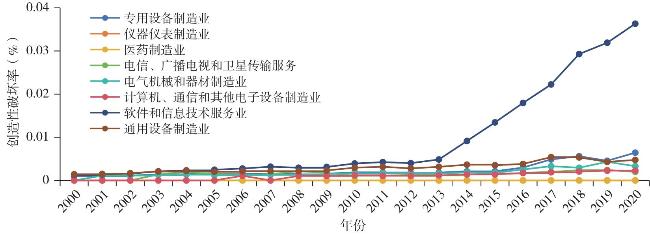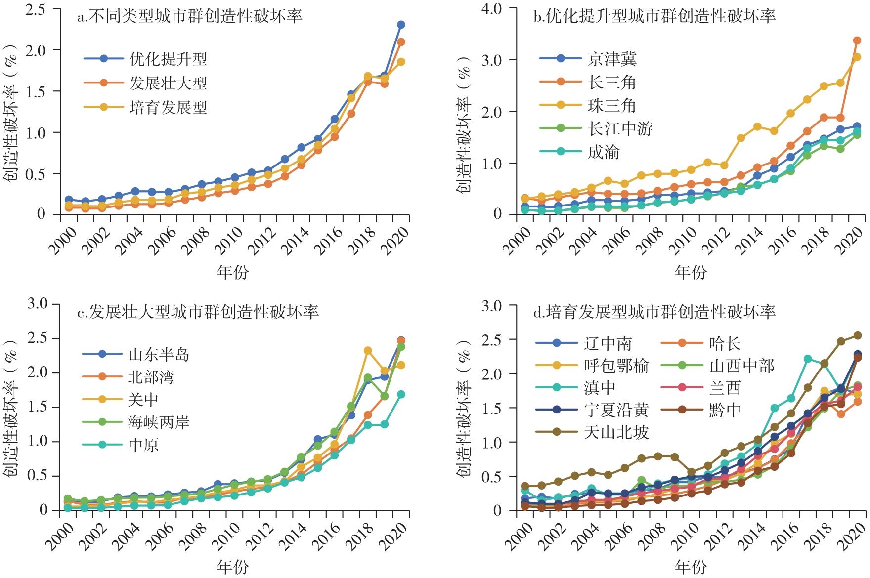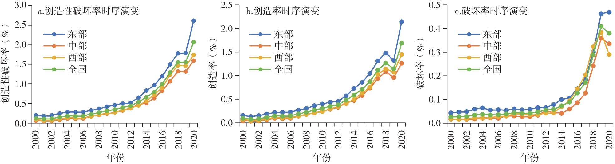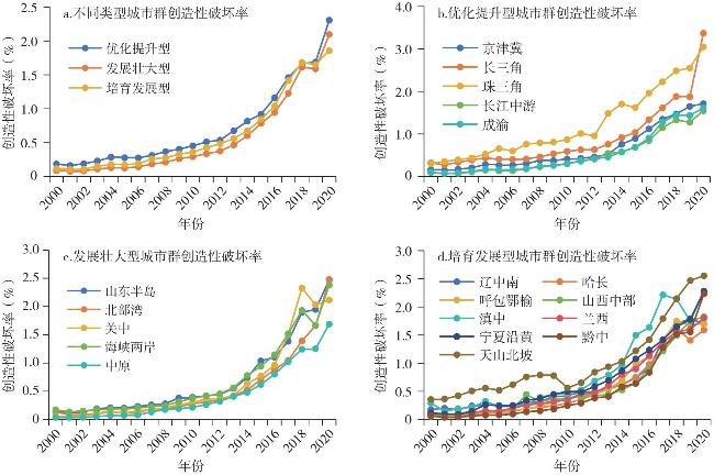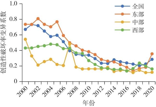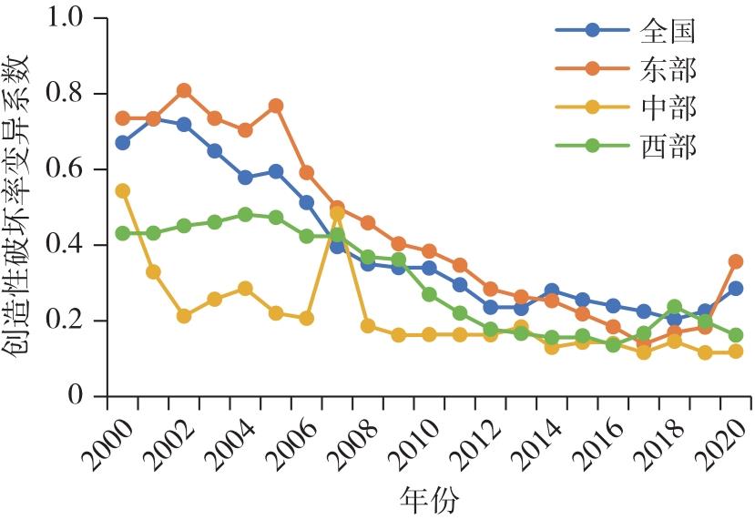 Creative destruction is the core driving force for long-term economic growth, and the entry and exit of market entities are the micro manifestations of the creative destruction process. Based on the registration data of industrial and commercial enterprises, this article calculated the level of creative destruction in 31 provinces of China from 2000 to 2020, analyzed the spatio-temporal differentiation pattern and evolution characteristics of creative destruction, revealed its regional differences by using the Dagum Gini coefficient, examined its convergence by using the σ and β convergence models, and discussed its heterogeneity according to different classification criteria. The research finds that: 1) The rate of creative destruction in China was in a stage of slow growth before 2014, but it showed a feature of explosive growth after 2014. The rate of creative destruction in different regions shows obvious spatial imbalance, with the eastern region taking an absolute leading position. 2) At the national level, the differences in the rate of creative destruction show short-term fluctuations and long-term narrowing characteristics, with the gap between the east and the central region being the main source. 3) The creative destruction rates across the country and in various regions exhibit σ convergence and absolute and conditional β convergence characteristics. 4)Marked divergence exists across urban agglomerations, with substantial variations in creative destruction rates among different high-tech industry sectors.