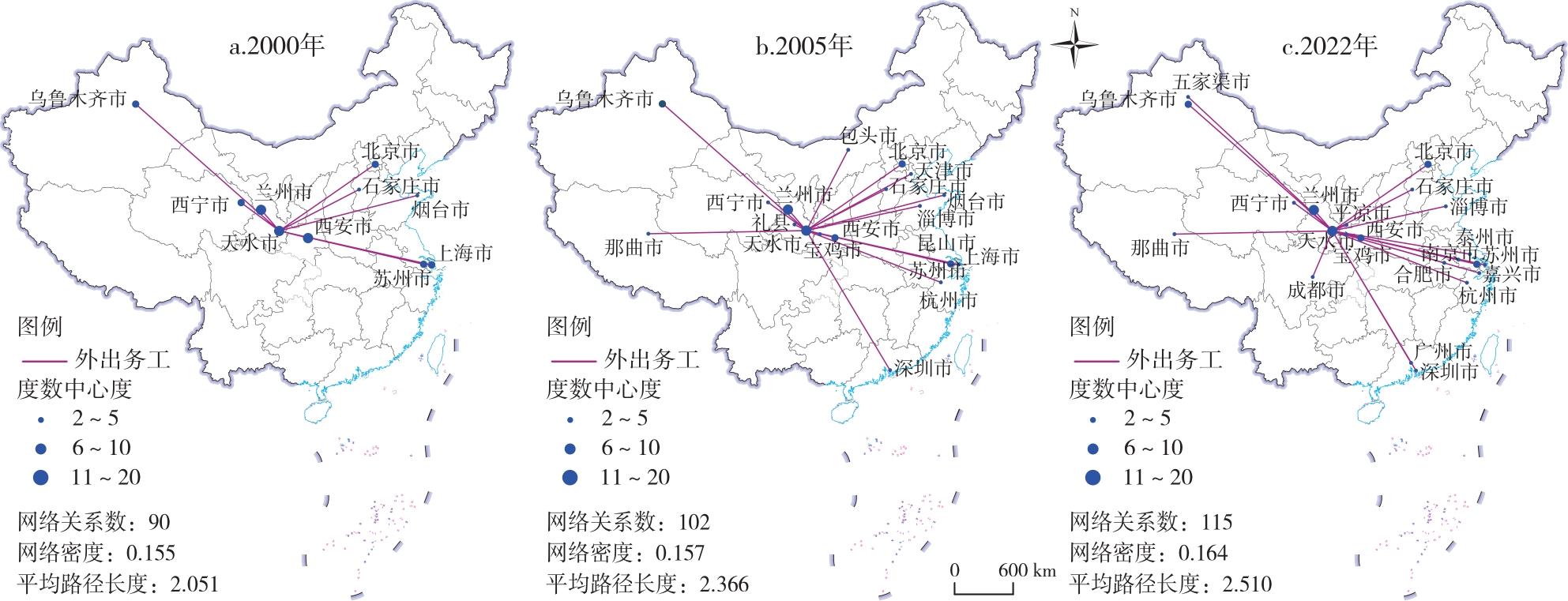 图3 云山镇乡村居民“外出务工”社会网络空间的演变注:该图基于自然资源部标准地图服务网站下载的审图号为GS(2023)2763的标准地图制作,底图边界无修改。图4同。 Fig.3 Evolution of the social network space of rural residents' "going out to work" in Yunshan Town |