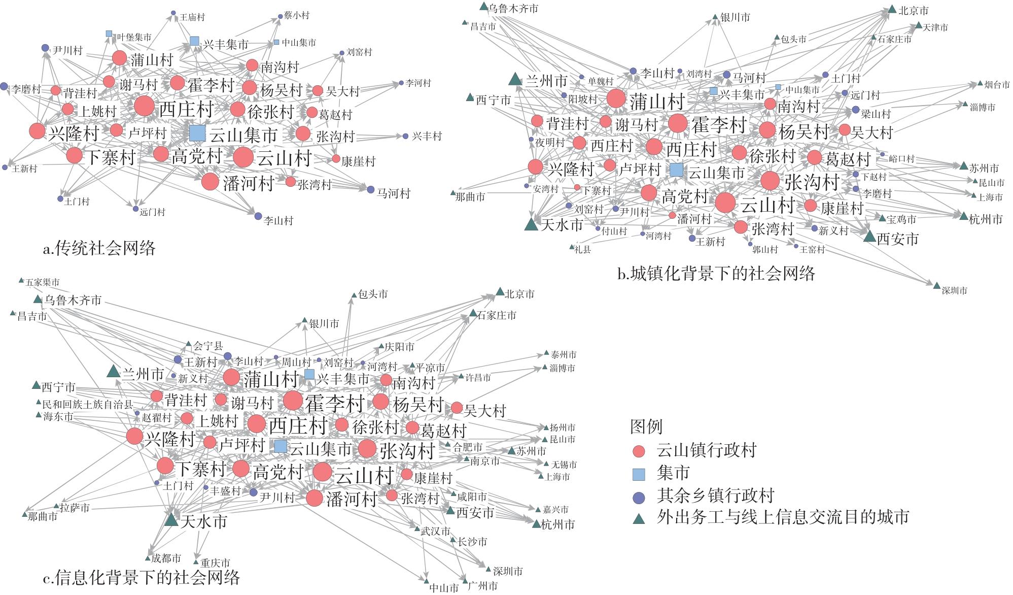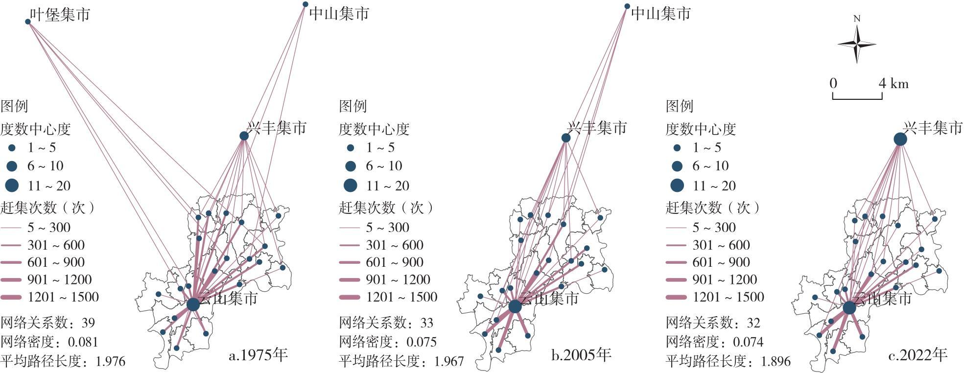 图1 云山镇乡村居民“赶集”社会网络空间的演变Fig.1 Evolution of the social network space of rural residents' "going to the fair" in Yunshan Town |