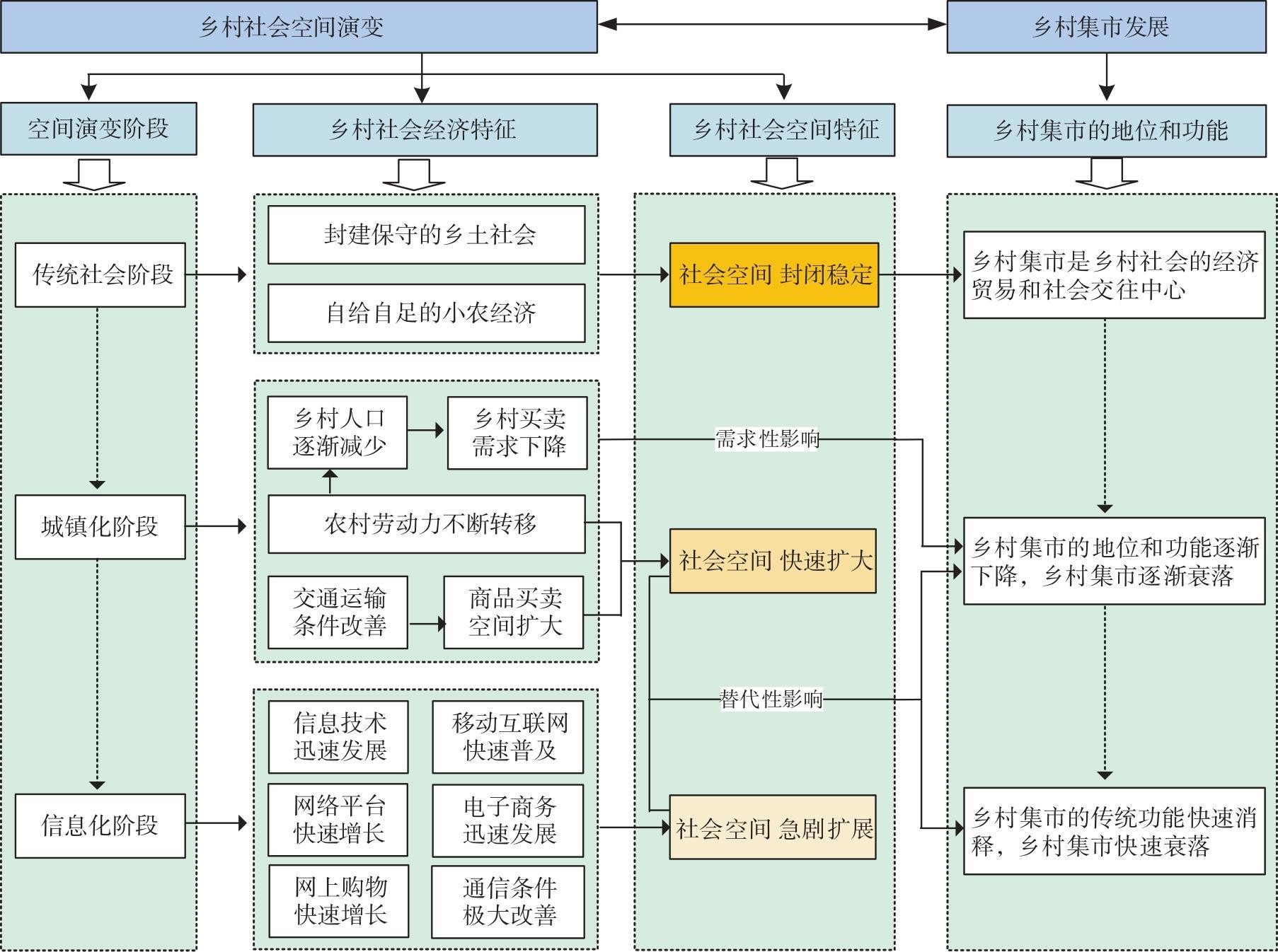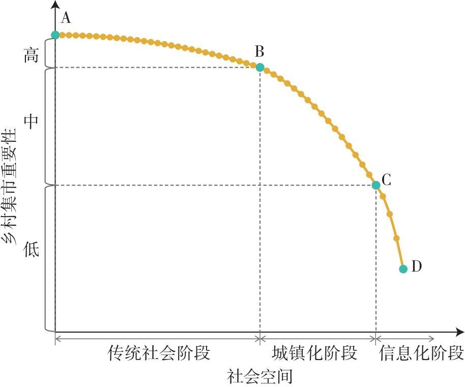 | 信息化时期 | 2022年 | 近年来,随着信息技术的快速发展,农村移动互联网快速普及,农村电子商务和网上购物迅猛发展,信息交流日益网络化和多元化,乡村社会空间迅速扩大 | 赶集、走亲访友、外出务工、信息交流、网购 |