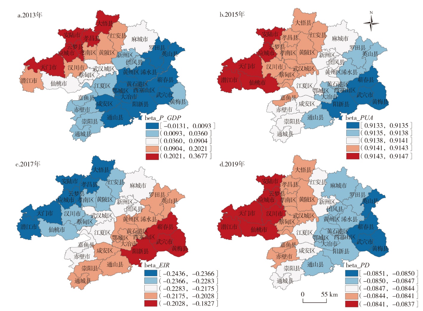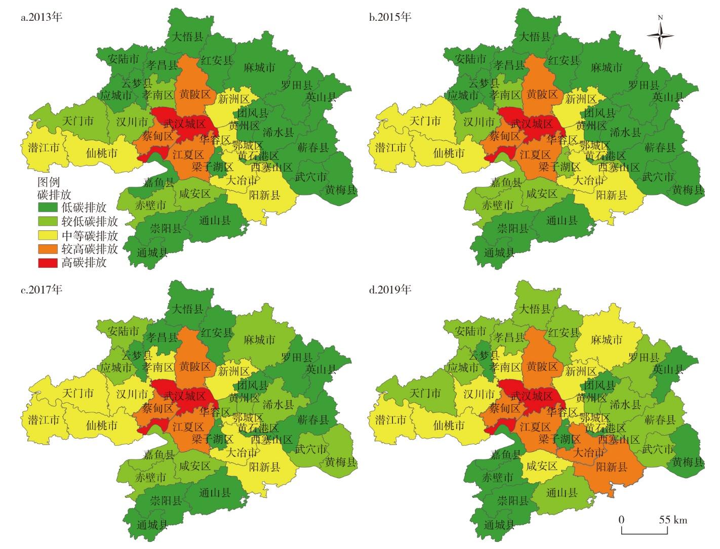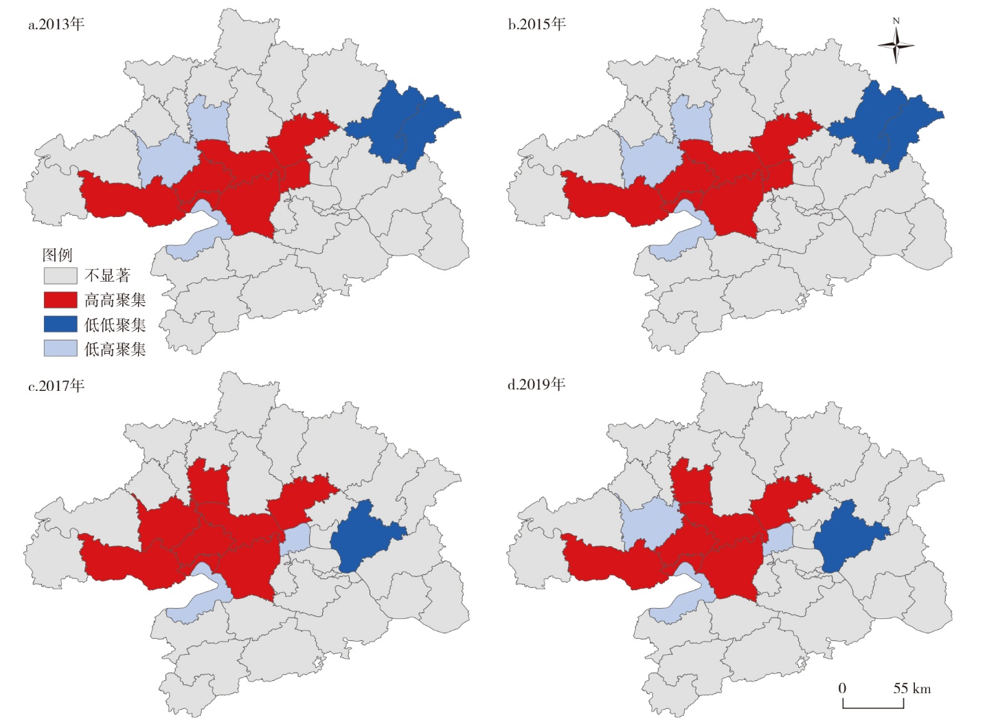 表4 武汉城市圈县域碳排放空间自相关莫兰指数Tab.4 Moran's index of spatial autocorrelation of carbon emissions in Wuhan urban circle at county level |