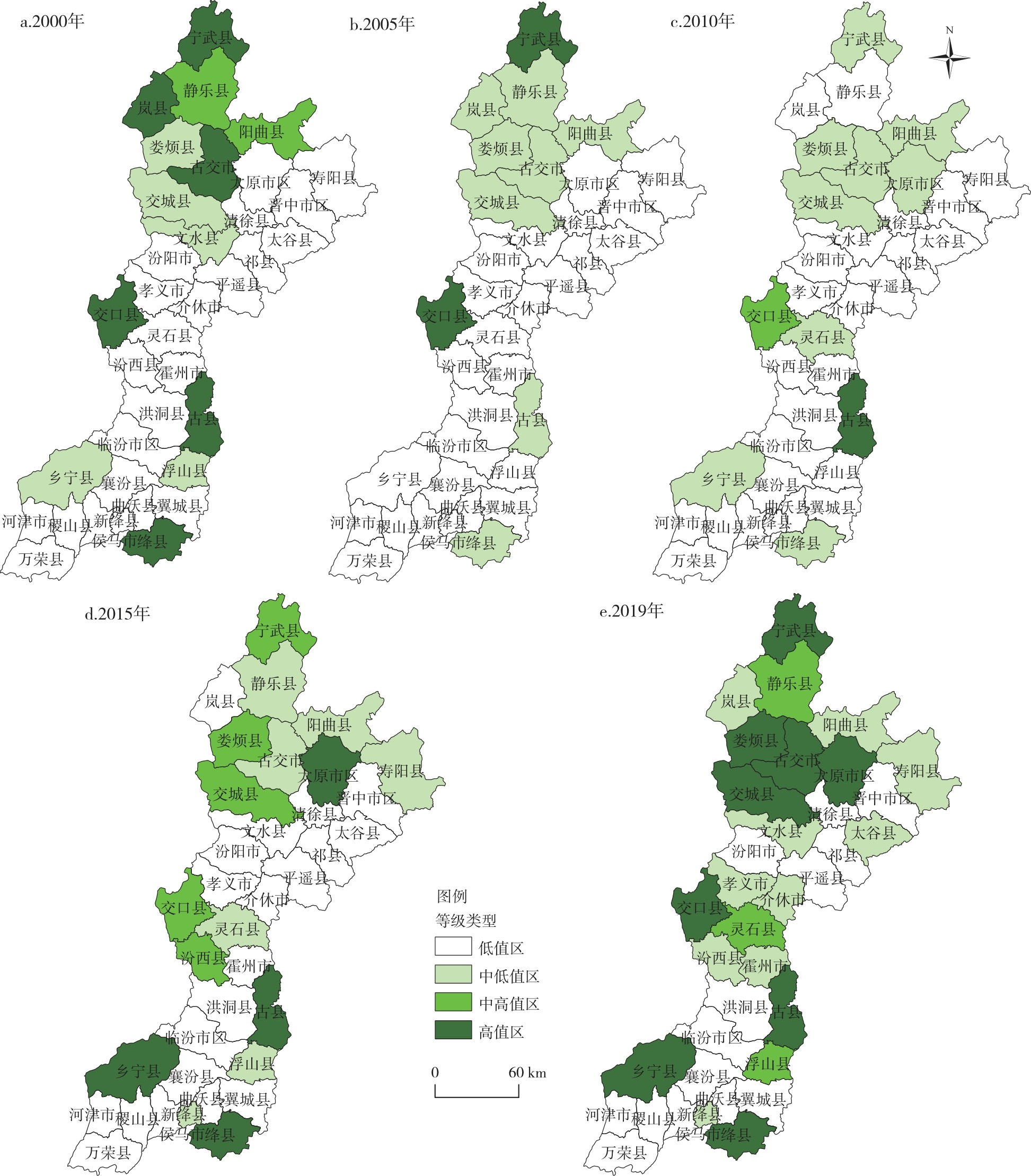 The spatial distribution pattern of ecological efficiency of counties in Fenhe River Basin from 2000 to 2019